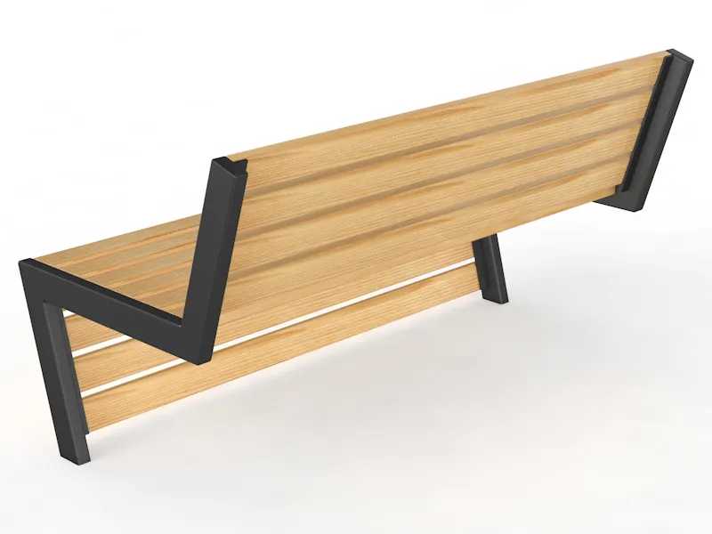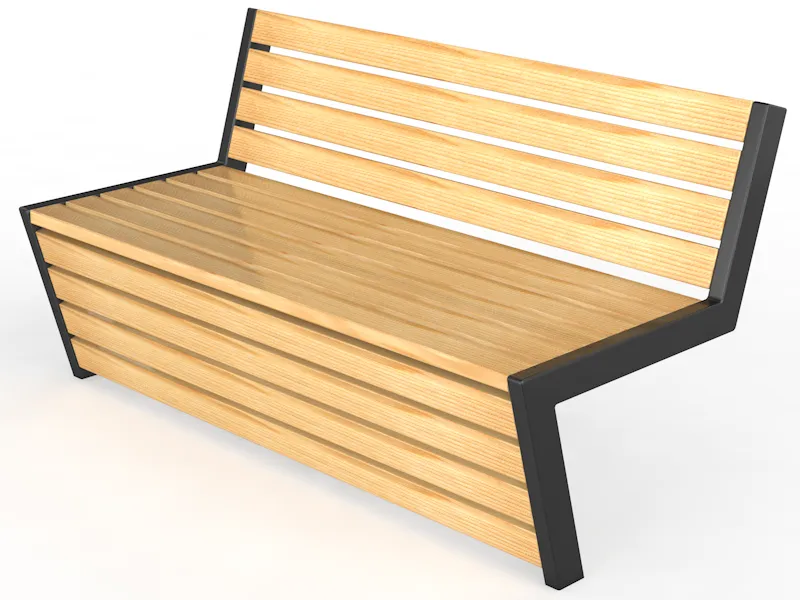 Каркас металлический, выполнен из профильной трубы 60х30х3 мм, покрашен порошковой краской. Настил деревянный, массив сосны, доски 100х40 мм, покрыты лаком. Торцы фрезерованы. Размеры скамьи варьируются от 1500 до 3000 мм. Тип крепления: бетонирование.