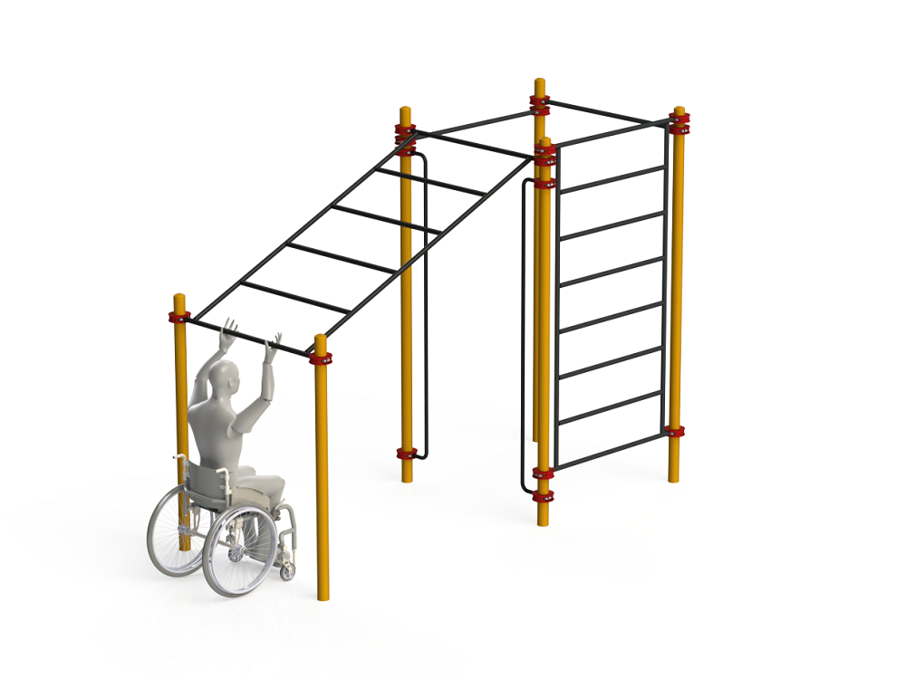В комплексе при помощи разъемных хомутов, состоящих из двух одинаковых полуколец к разноуровневым столбам под углом крепится одиночный рукоход, вертикально крепится шведская стенка и вспомогательные поручни.