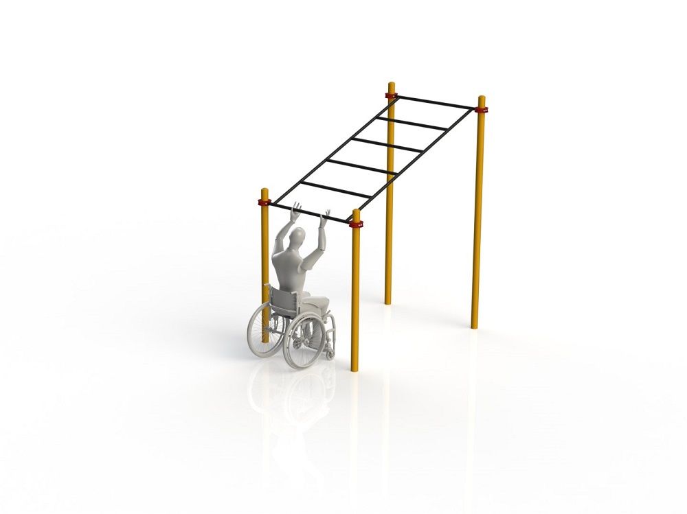 В комплексе к разноуровневым столбам под углом крепится одиночный рукоход при помощи разъемных хомутов, состоящих из двух одинаковых полуколец.