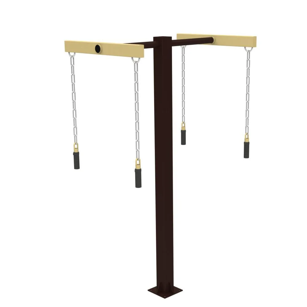 Изделие производится из стали, обладает высокой прочностью и долговечностью. Рифленые рукоятки изготавливаются из ПВХ. Тренажер рассчитан на тренировку одновременно двух пользователей.