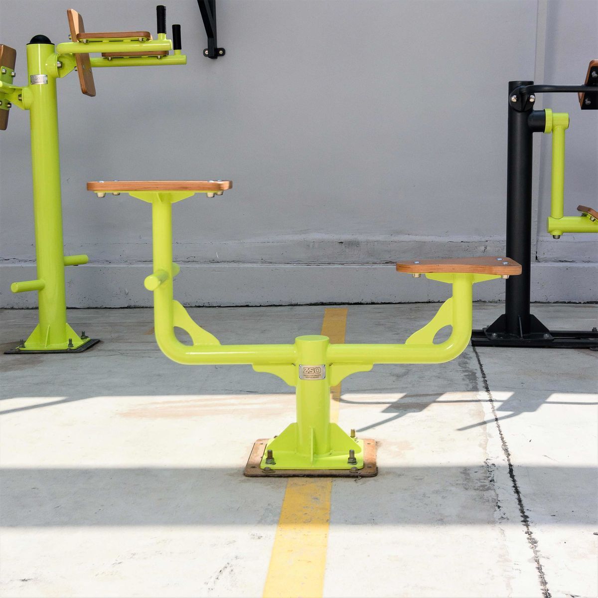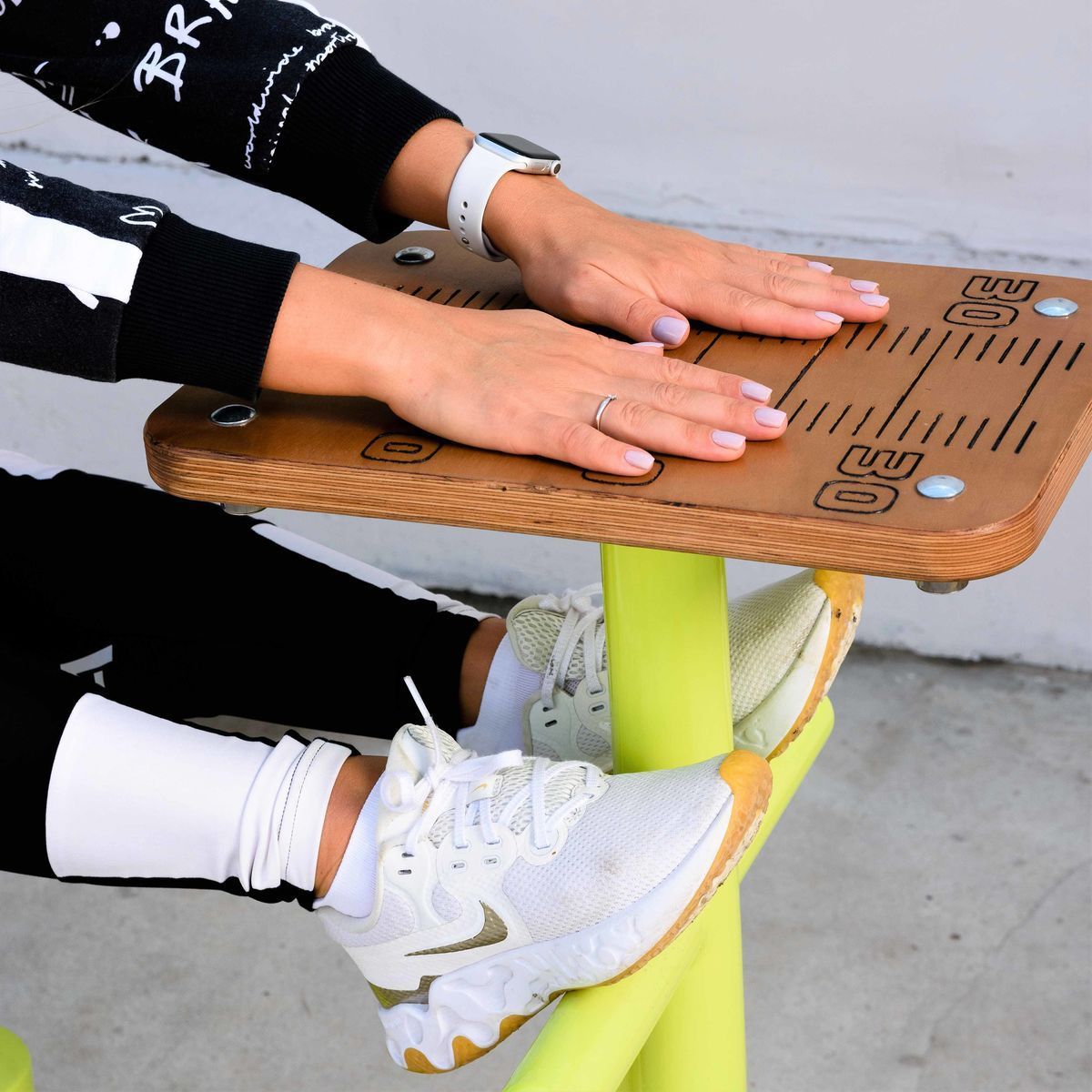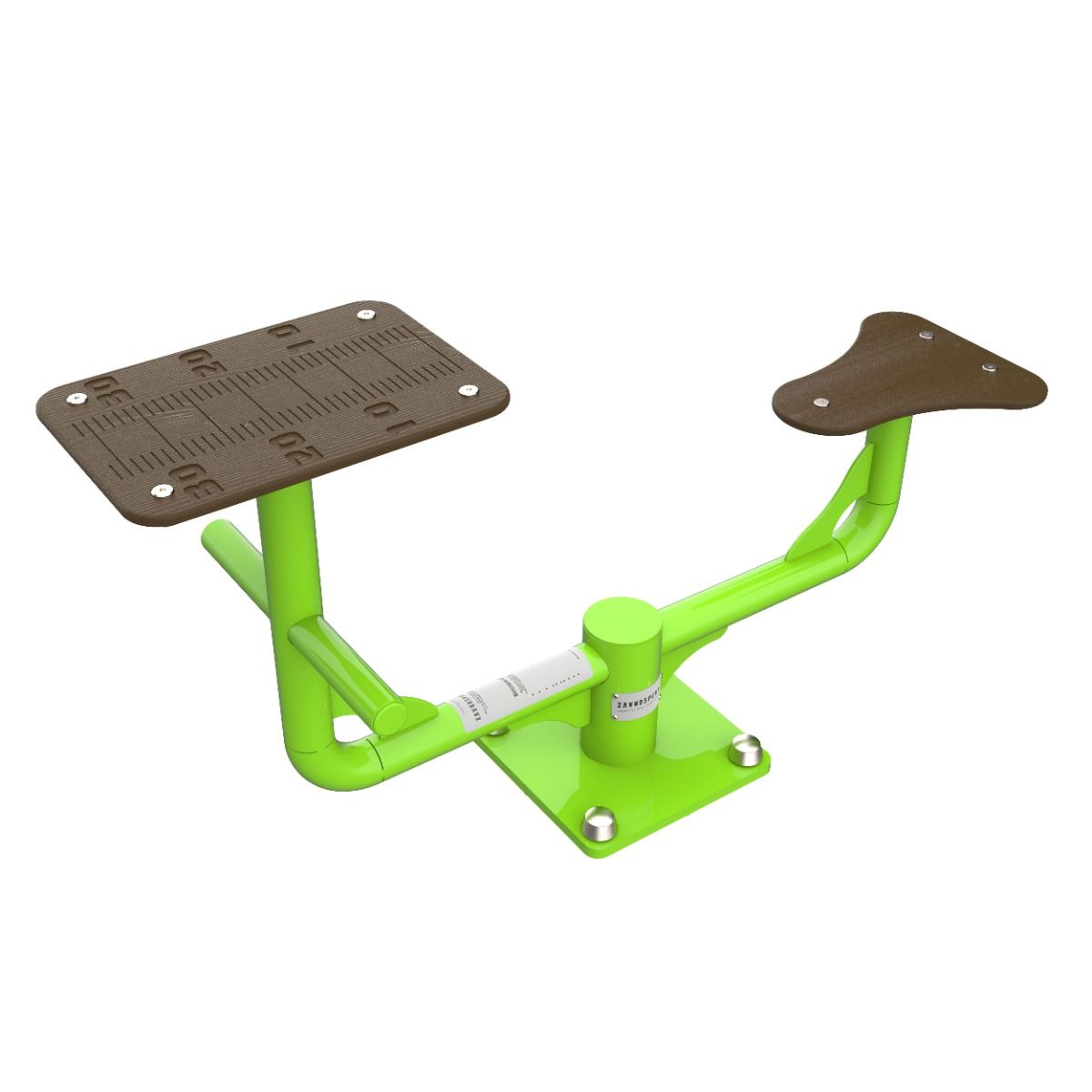 Сиденье 350×300 мм и мерная шкала 280×400 мм выполнены из высокопрочного ударостойкого HPL-пластика толщиной 12 мм. Установлены на основании из листового металла толщиной 5 мм, приваренное к раме тренажера.