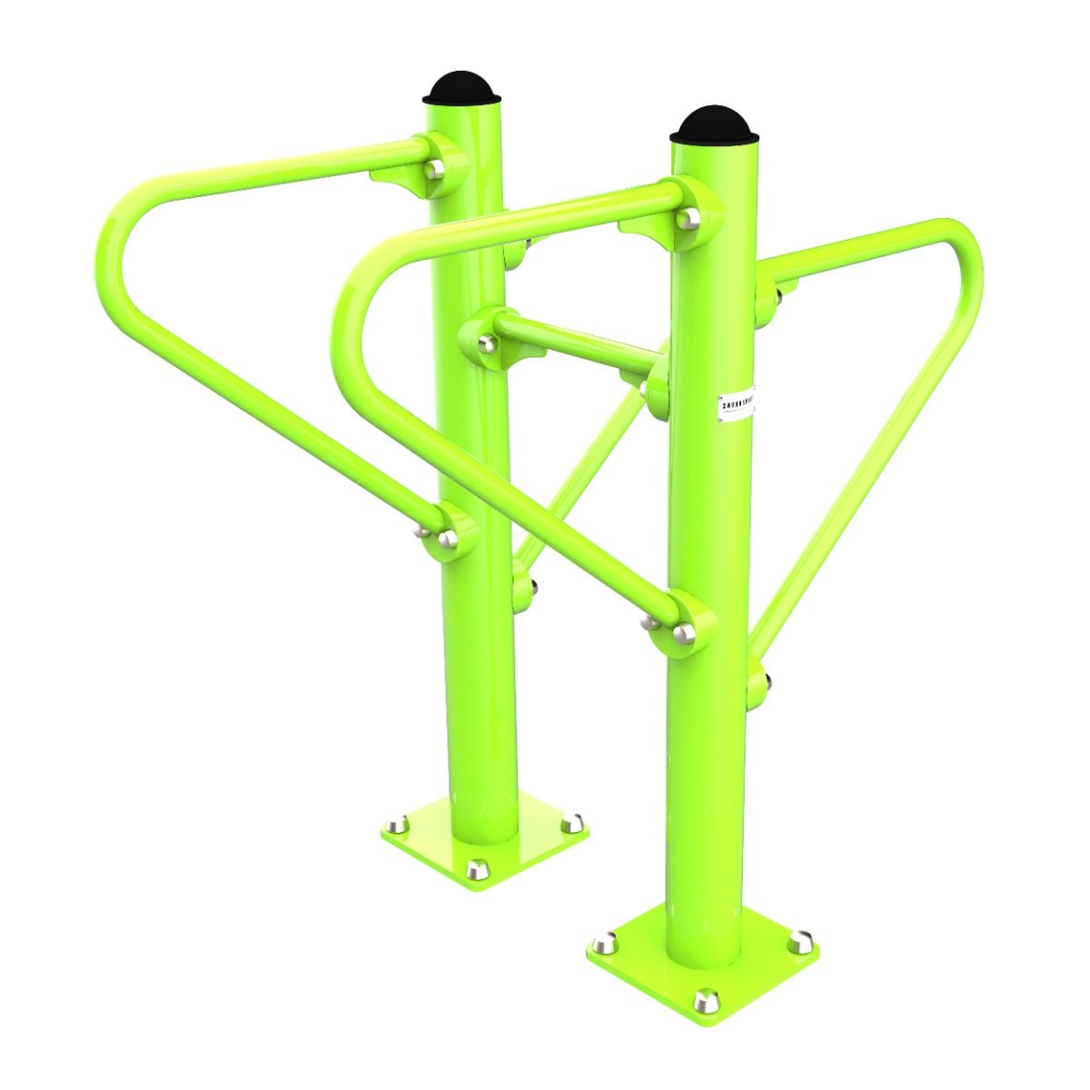 Оборудование состоит из стоек, брусьев, перекладины и закладных. Закладные монтируются в грунт и заливаются бетоном. Стойки крепятся к закладным за счет фланцевого соединения и отсыпаются песчано-гравийной смесью до уровня площадки. Фланцевое крепление позволяет надёжно смонтировать оборудование и беспрепятственно демонтировать при необходимости обслуживания. Монтажные схемы прилагаются к комплекту поставки.