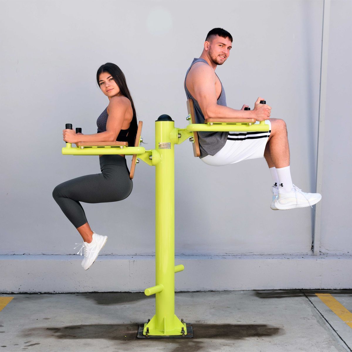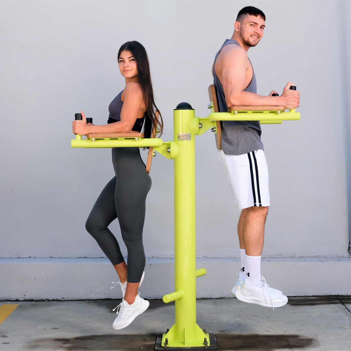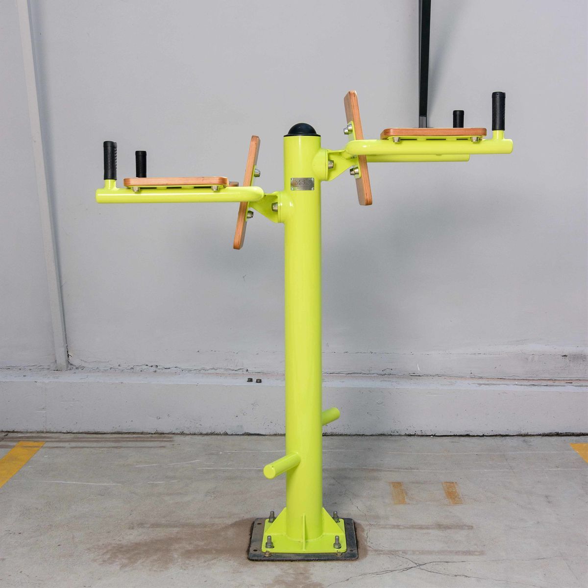 Фланцевое соединение опорного столба с закладной производится через четыре овальных отверстия размером 22×30 мм, расположенных на расстоянии 240 мм. Овальные отверстия под болтовое крепление М16 позволяют дополнительно регулировать положение тренажера. Резьбовые соединения защищены составными металлическими колпачками, входящими в комплект поставки.