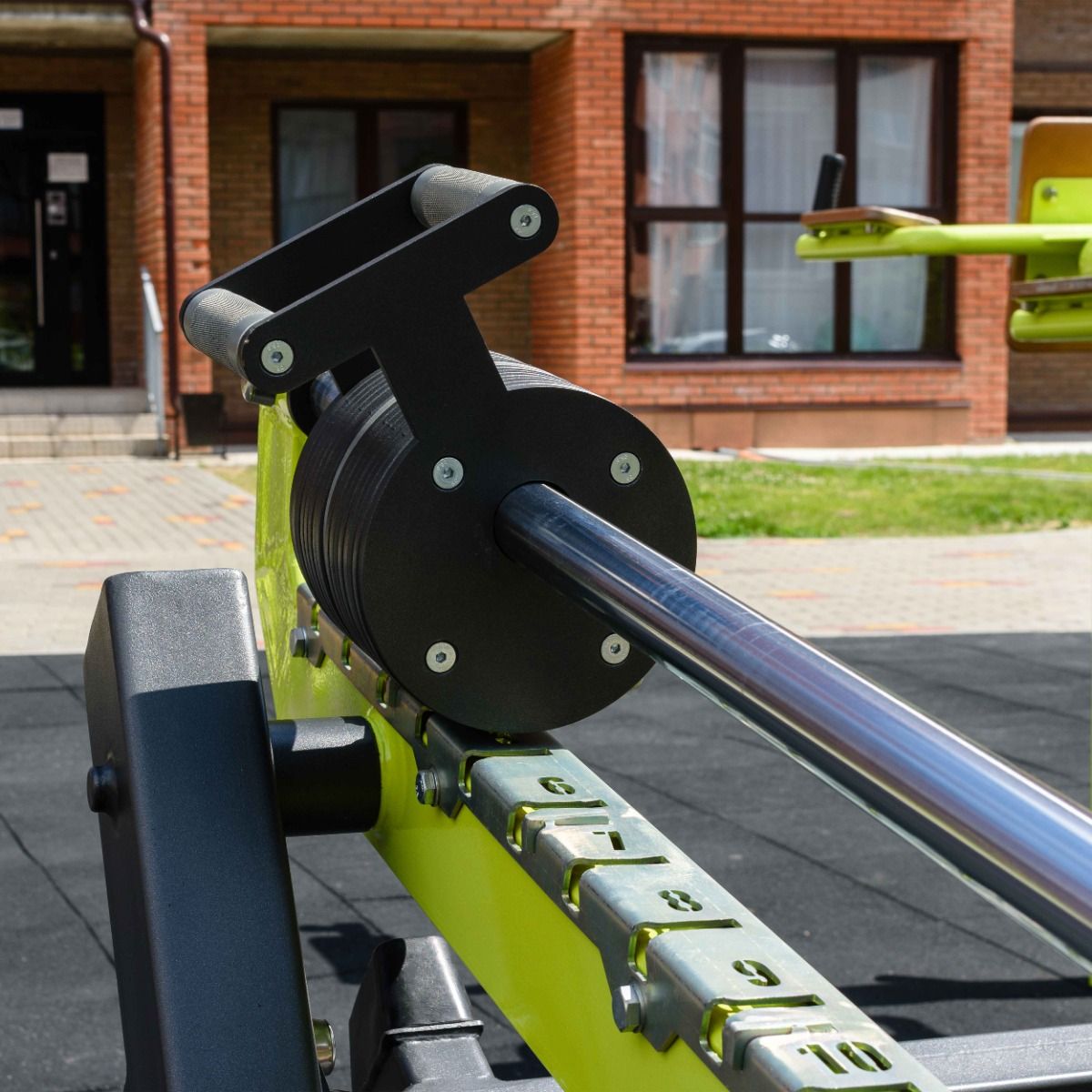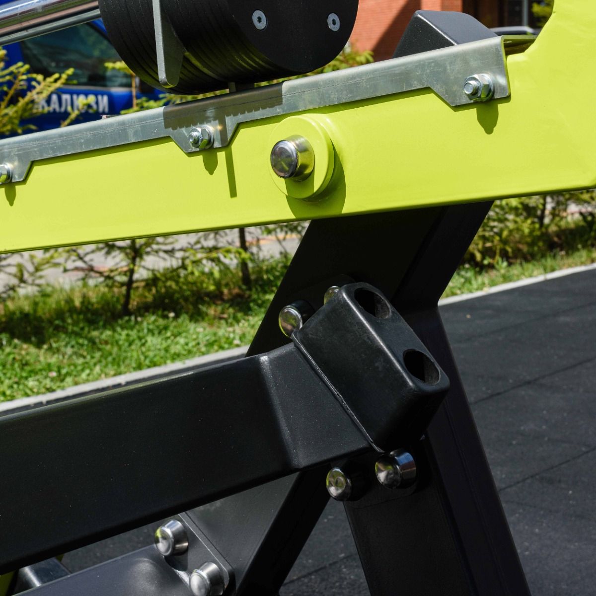 Надёжность и прочность разъёмных соединений конструктивных элементов тренажёра обеспечиваются за счёт использования высококачественного оцинкованного крепежа, выступающие части которого закрыты металлическими защитными колпачками.