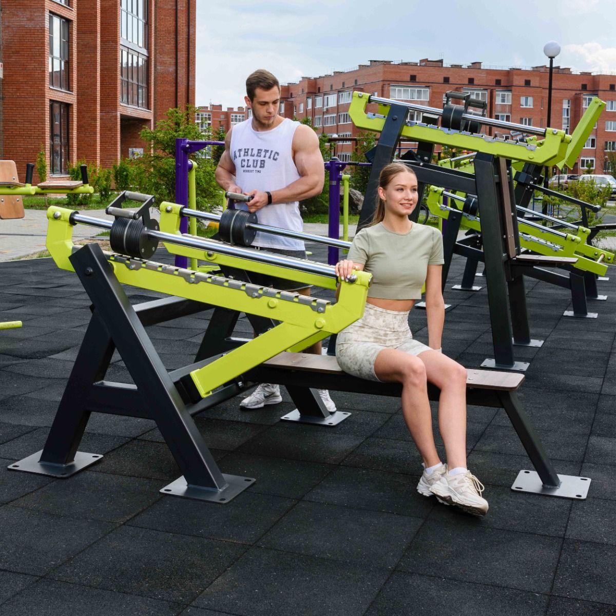 Оборудование состоит из закладных и тренажера. Закладные монтируются в грунт и заливаются бетоном. Тренажер крепится к закладным за счет фланцевого соединения и отсыпается песчано-гравийной смесью до уровня площадки. Фланцевое крепление позволяет надёжно смонтировать тренажер и беспрепятственно демонтировать при необходимости ремонта. Монтажные схемы прилагаются к комплекту поставки.