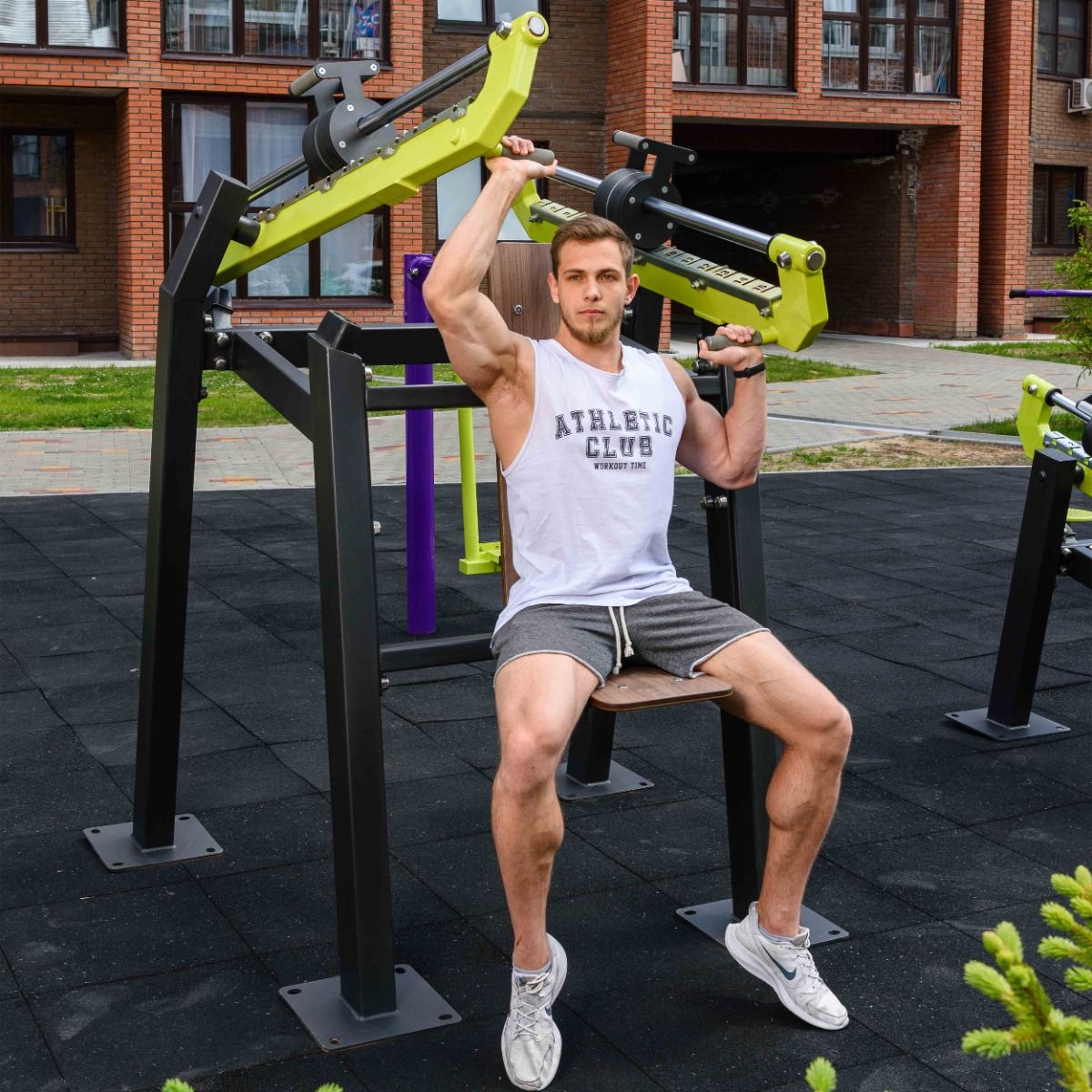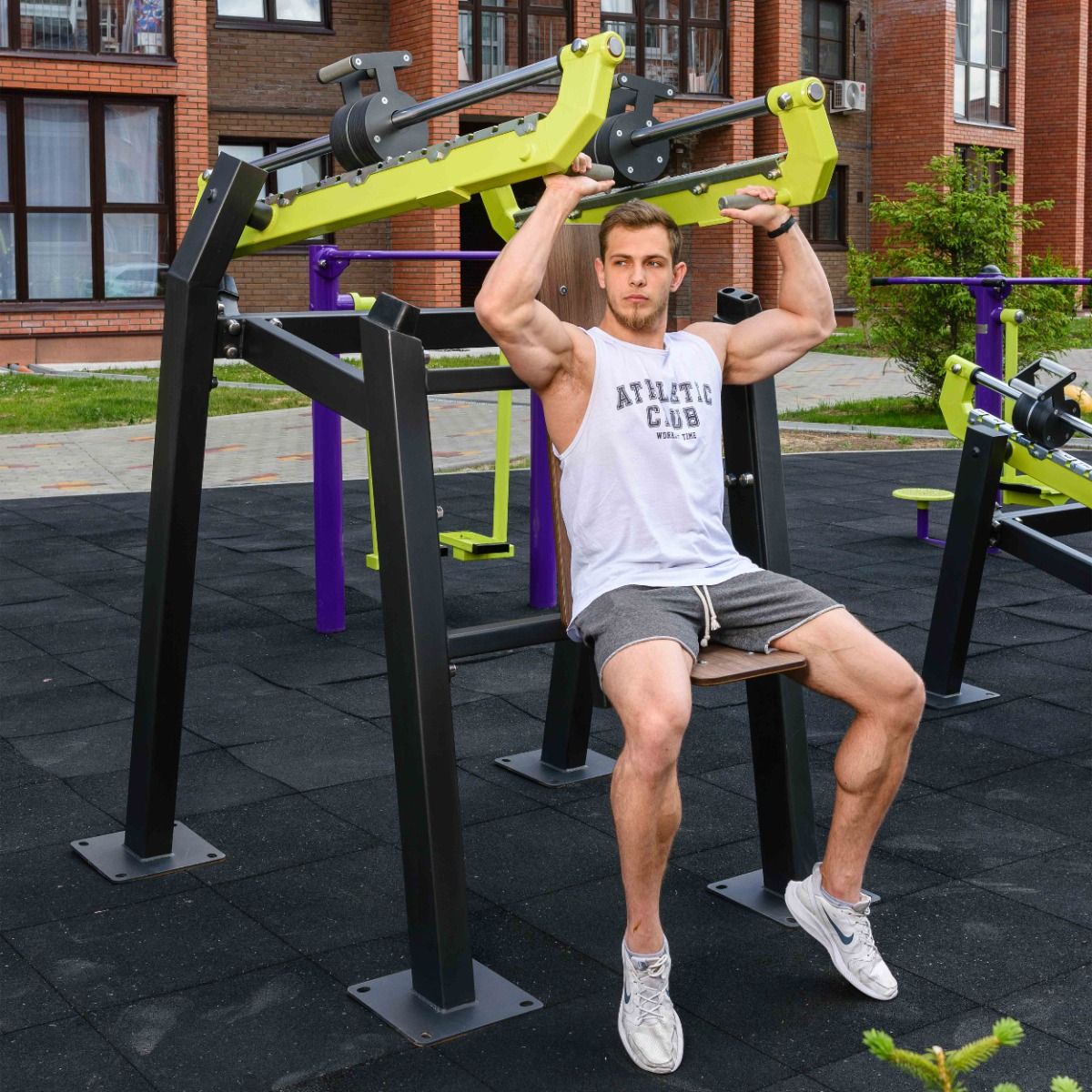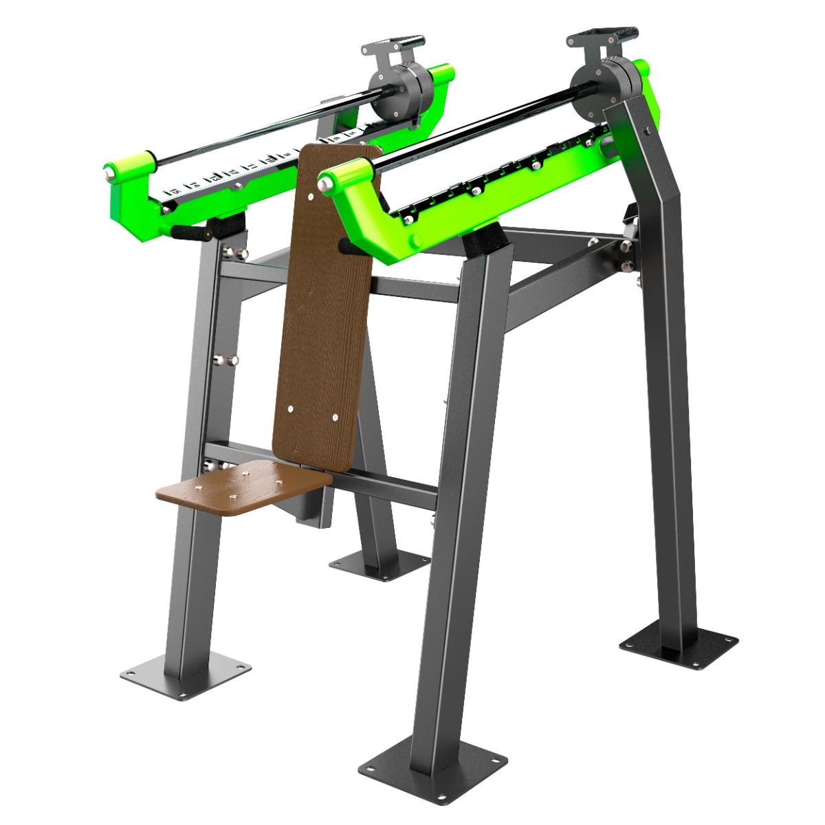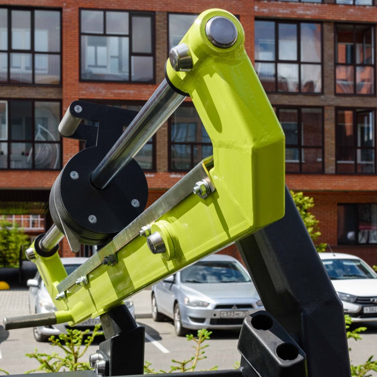 Несущая конструкция уличного тренажера выполнена из профильных труб 120×80×3 мм, 100×50×3 мм и 80×40×2 мм. Детали изготовлены из листового металла толщиной 8 мм и 3 мм.