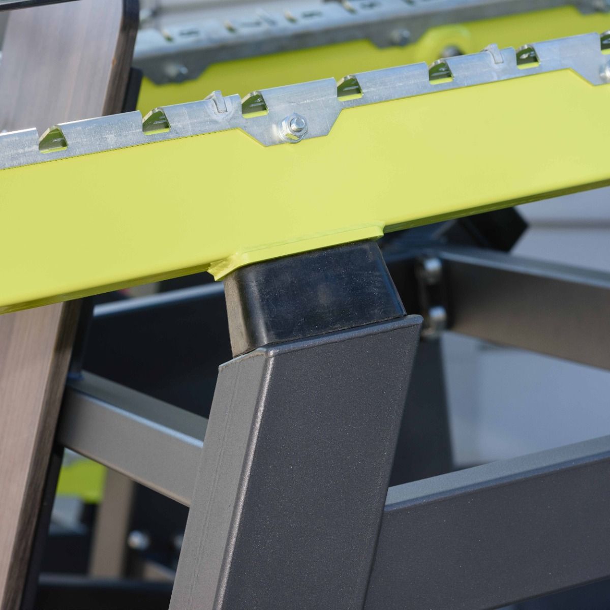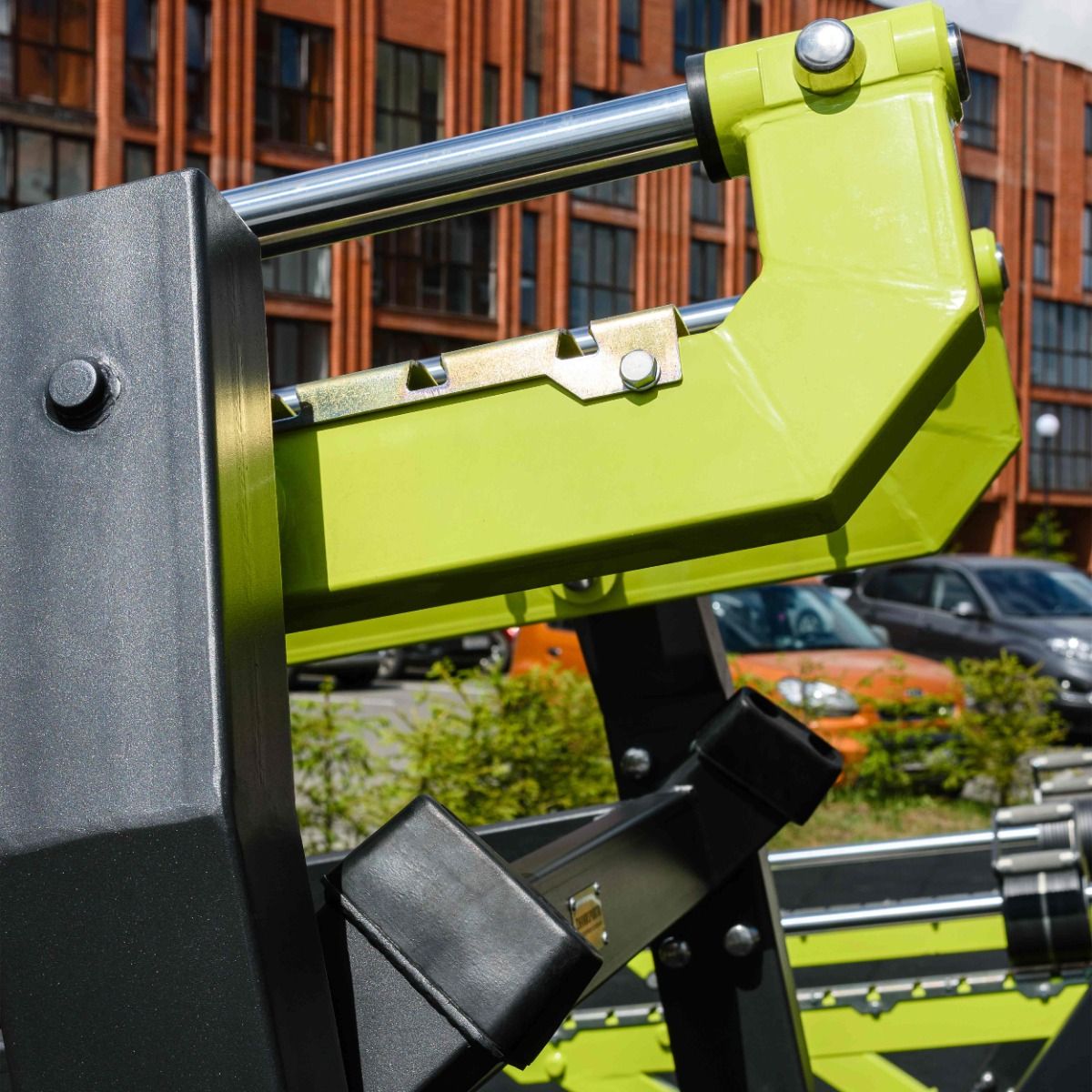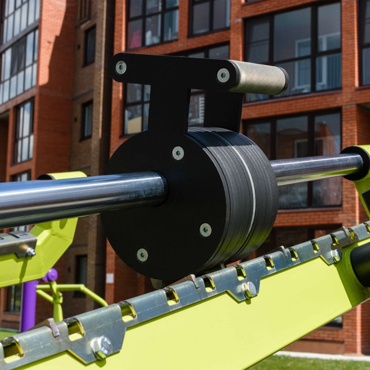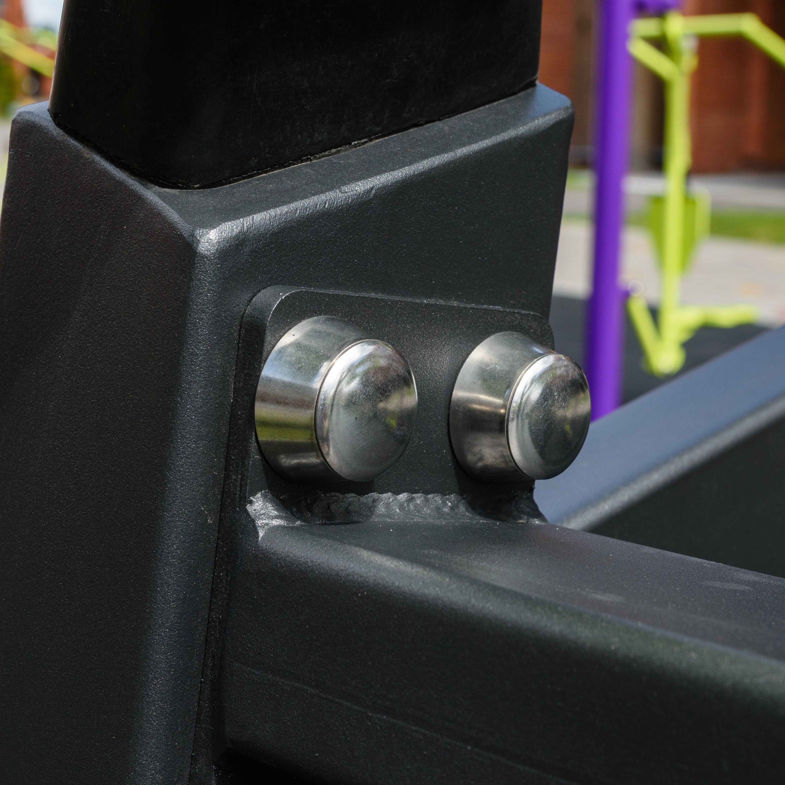 Надёжность и прочность разъёмных соединений конструктивных элементов тренажёра обеспечиваются за счёт использования высококачественного оцинкованного крепежа, выступающие части которого закрыты металлическими защитными колпачками.