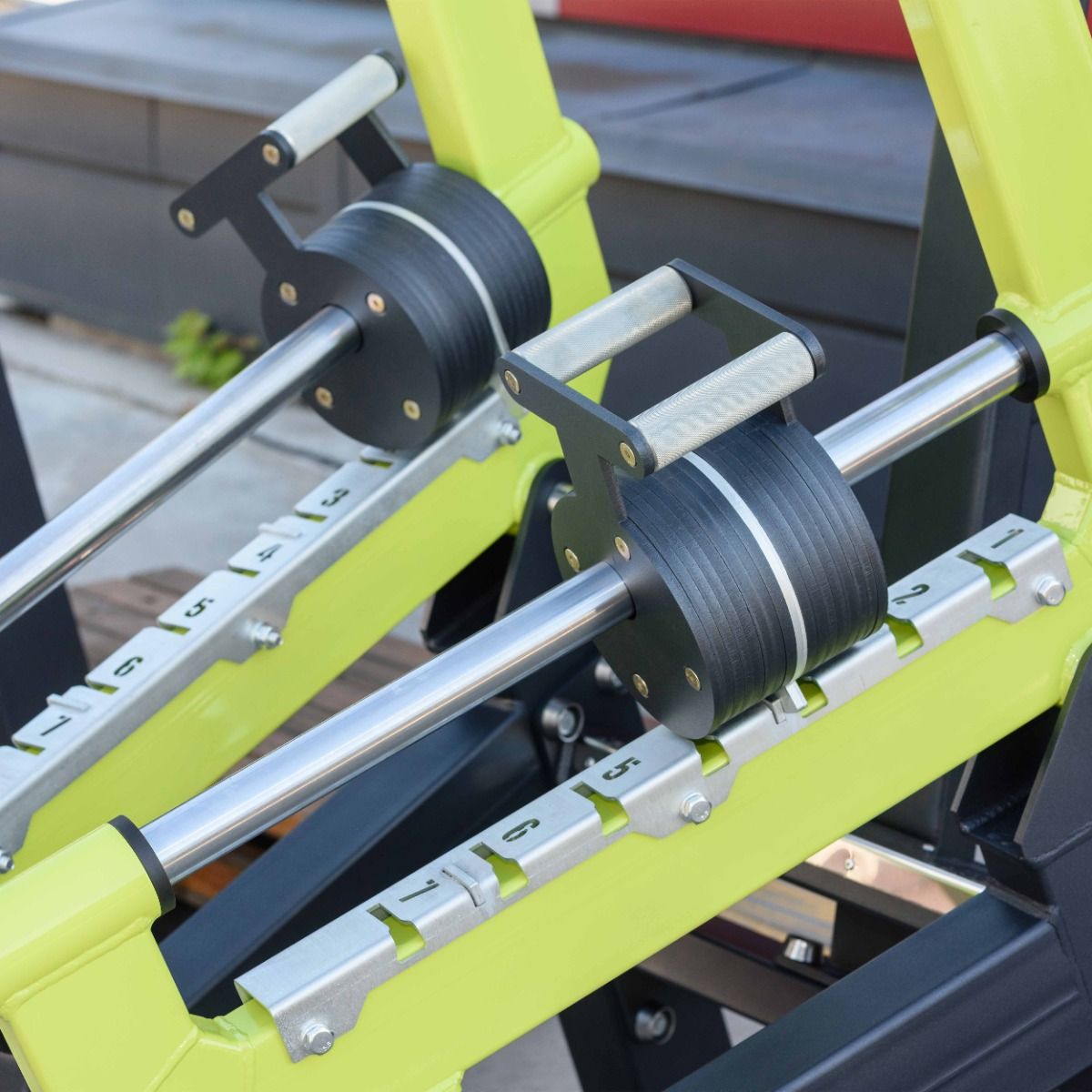Стартовый вес на один подвижный рычаг 25 кг с шагом 2 кг. Плавное ступенчатое увеличение нагрузки доступно в 7 положениях. Общий стартовый вес на два рычага 50 кг, максимальный - 64 кг.