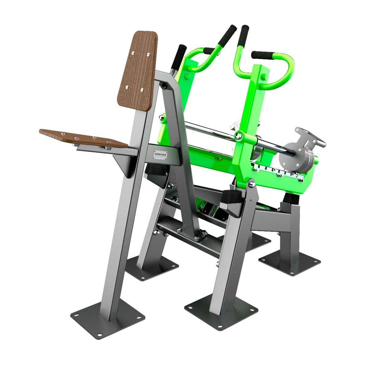 Надёжность и прочность разъёмных соединений конструктивных элементов тренажёра обеспечиваются за счёт использования высококачественного оцинкованного крепежа, выступающие части которого закрыты металлическими защитными колпачками.