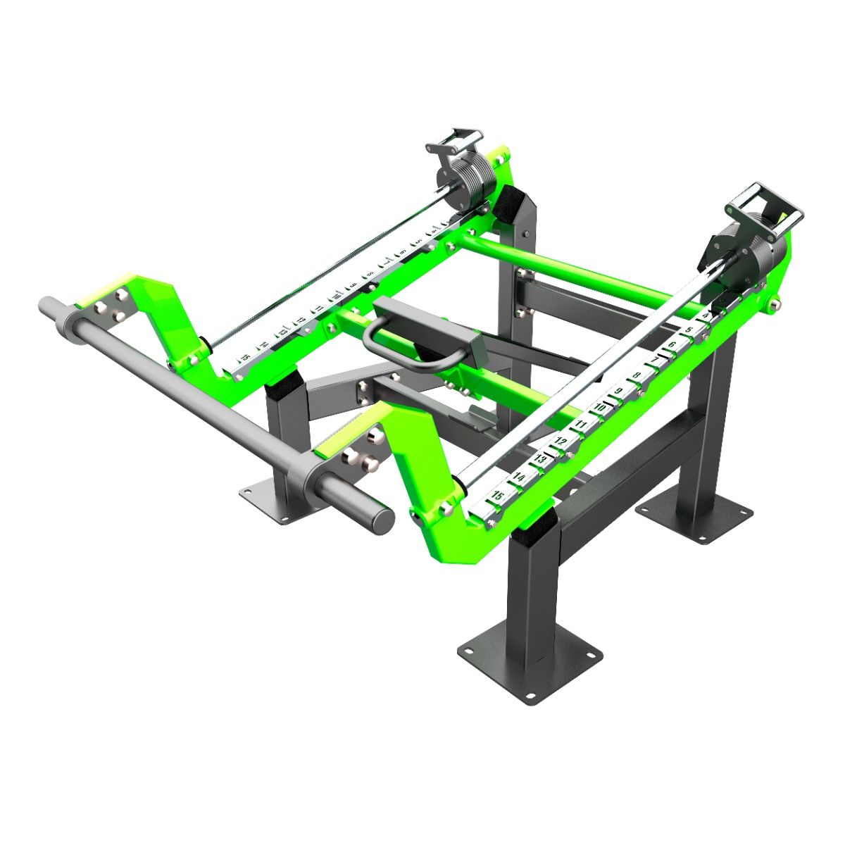 Несущая конструкция уличного тренажера выполнена из профильных труб 120×80 мм и 100×50 мм с толщиной стенки 3 мм. Детали изготовлены из листового металла толщиной 8 мм, 6 мм и 5 мм.