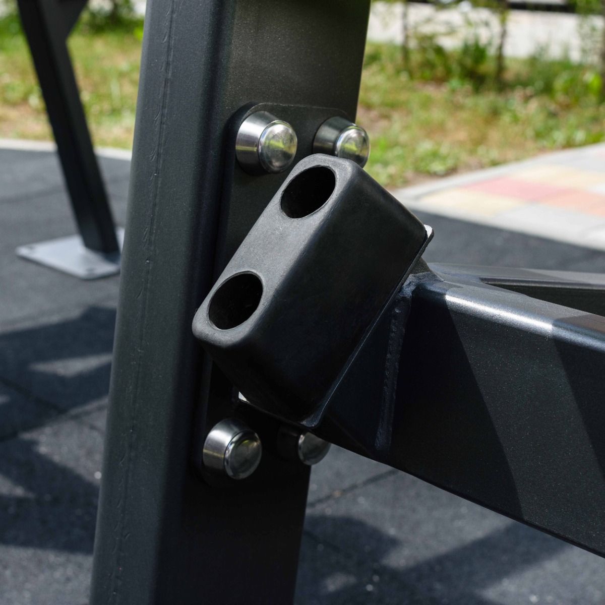Надёжность и прочность разъёмных соединений конструктивных элементов тренажёра обеспечиваются за счёт использования высококачественного оцинкованного крепежа, выступающие части которого закрыты металлическими защитными колпачками.