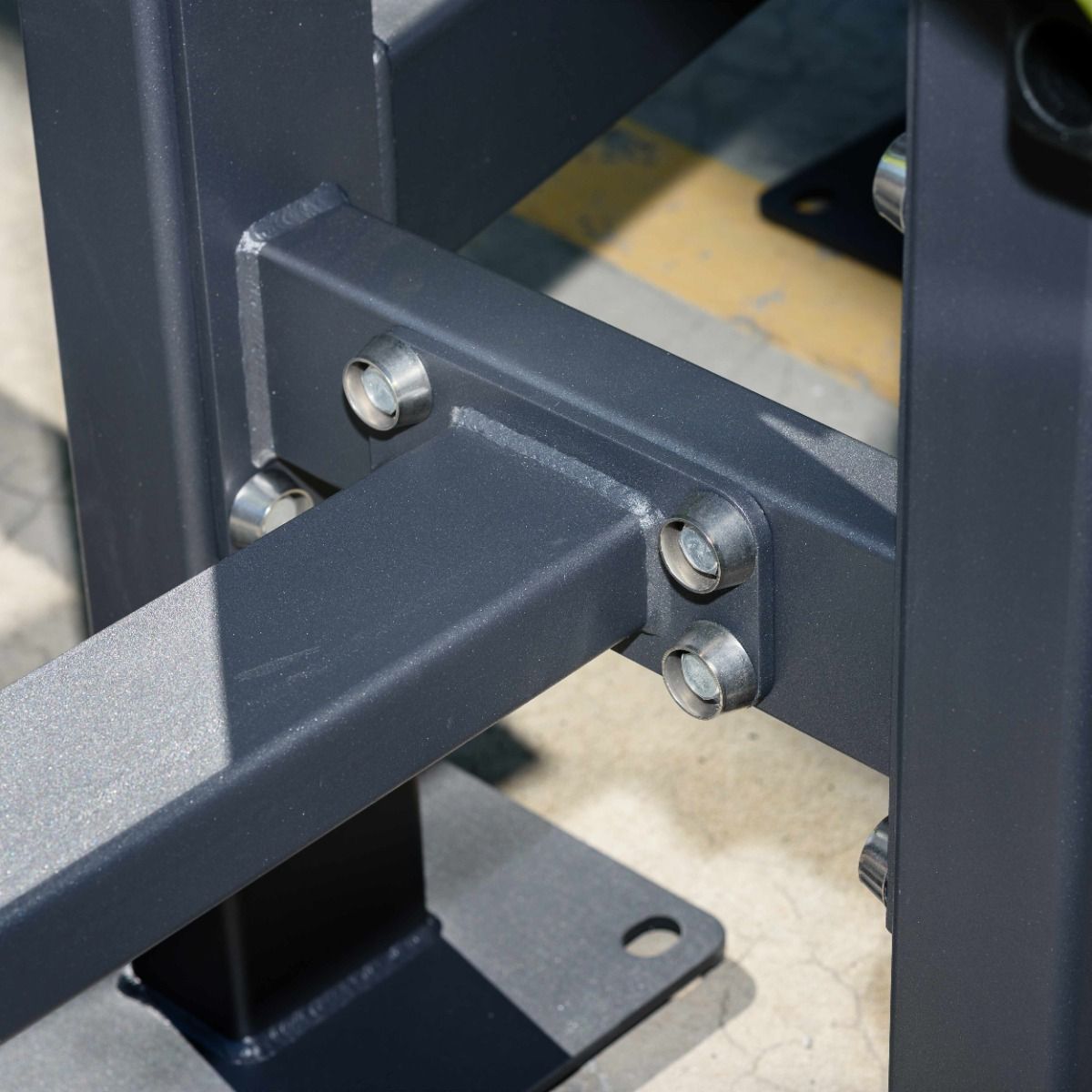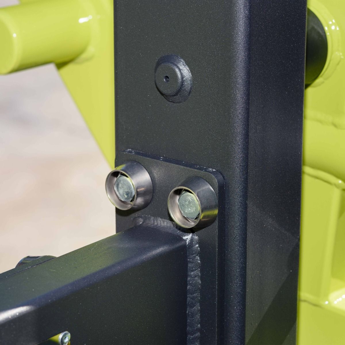 Надёжность и прочность разъёмных соединений конструктивных элементов тренажёра обеспечиваются за счёт использования высококачественного оцинкованного крепежа, выступающие части которого закрыты металлическими защитными колпачками.