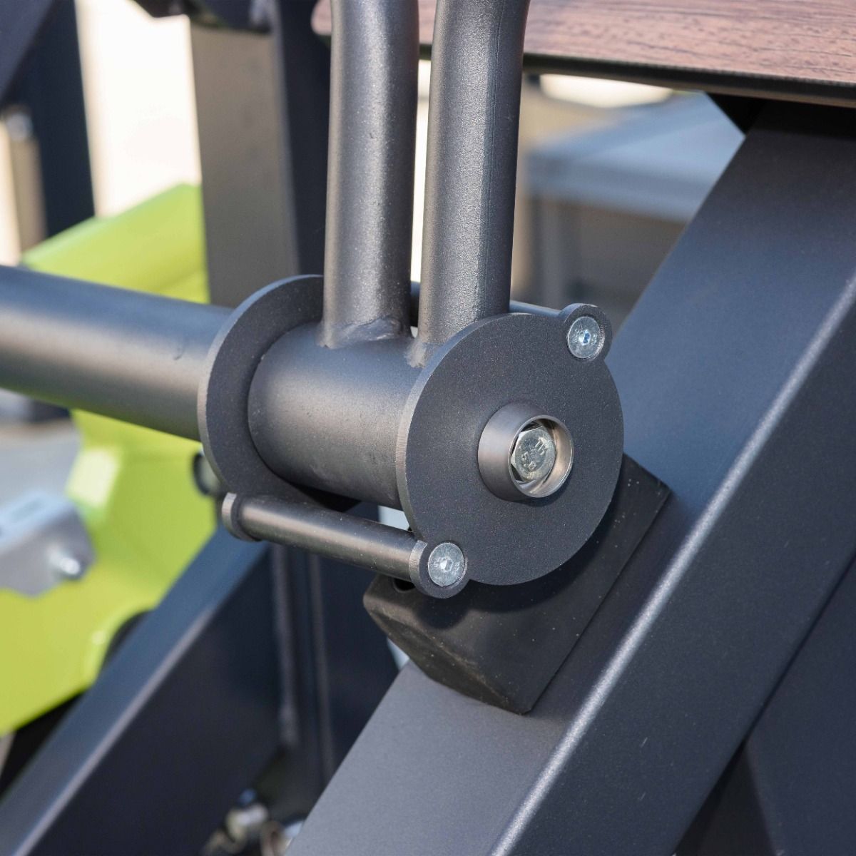 Надёжность и прочность разъёмных соединений конструктивных элементов тренажёра обеспечиваются за счёт использования высококачественного оцинкованного крепежа, выступающие части которого закрыты металлическими защитными колпачками.