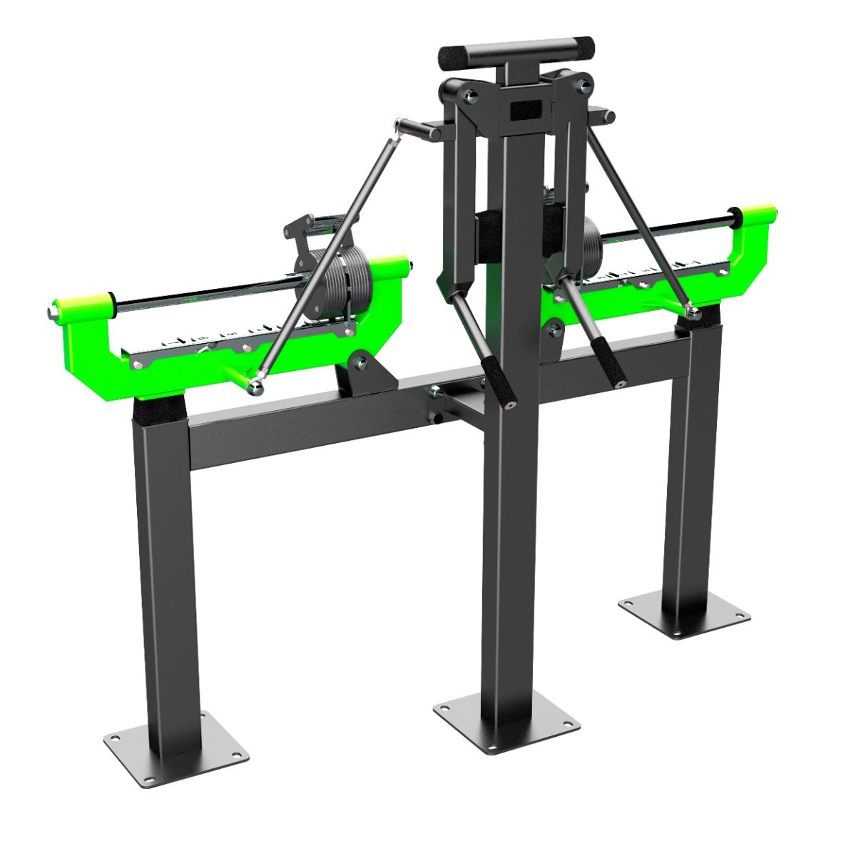 Несущая конструкция уличного тренажера выполнена из профильных труб 120×80 мм и 100×50 мм с толщиной стенки 3 мм. Детали изготовлены из листового металла толщиной 8 мм, 5 мм и 3 мм.