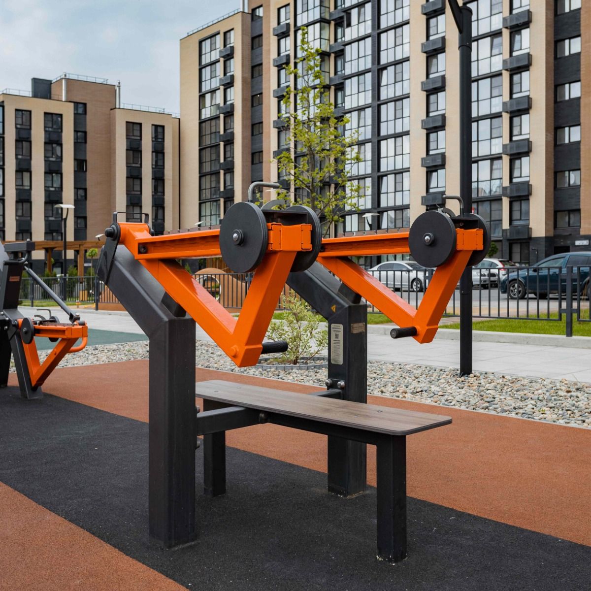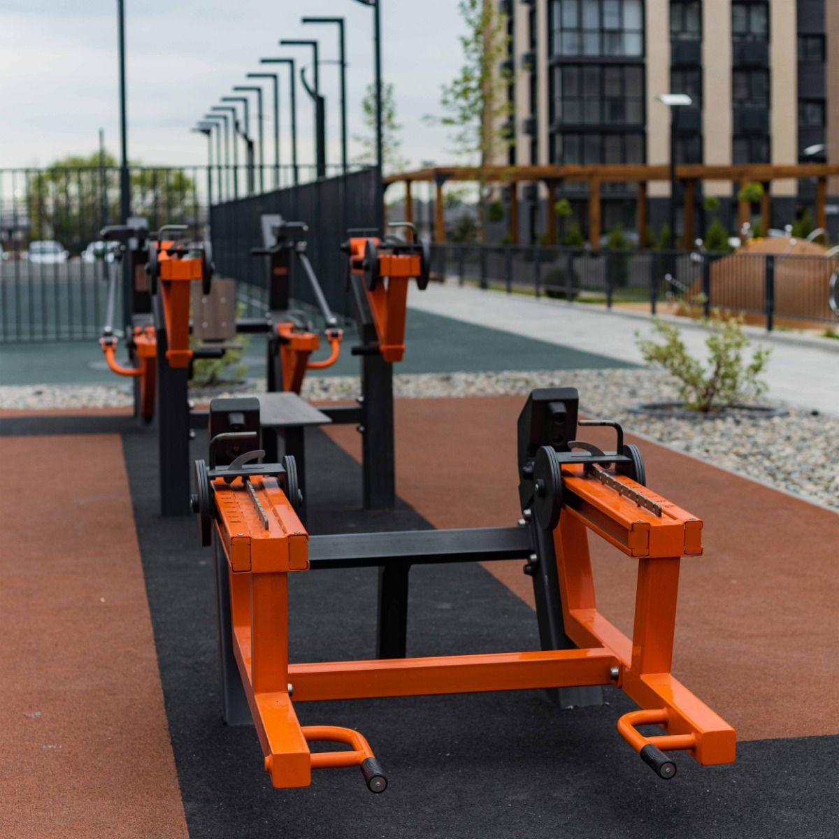 Надёжность и прочность разъёмных соединений конструктивных элементов тренажёра обеспечиваются за счёт использования высококачественного оцинкованного крепежа, выступающие части которого закрыты металлическими защитными колпачками.