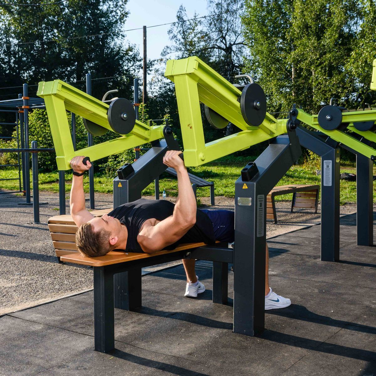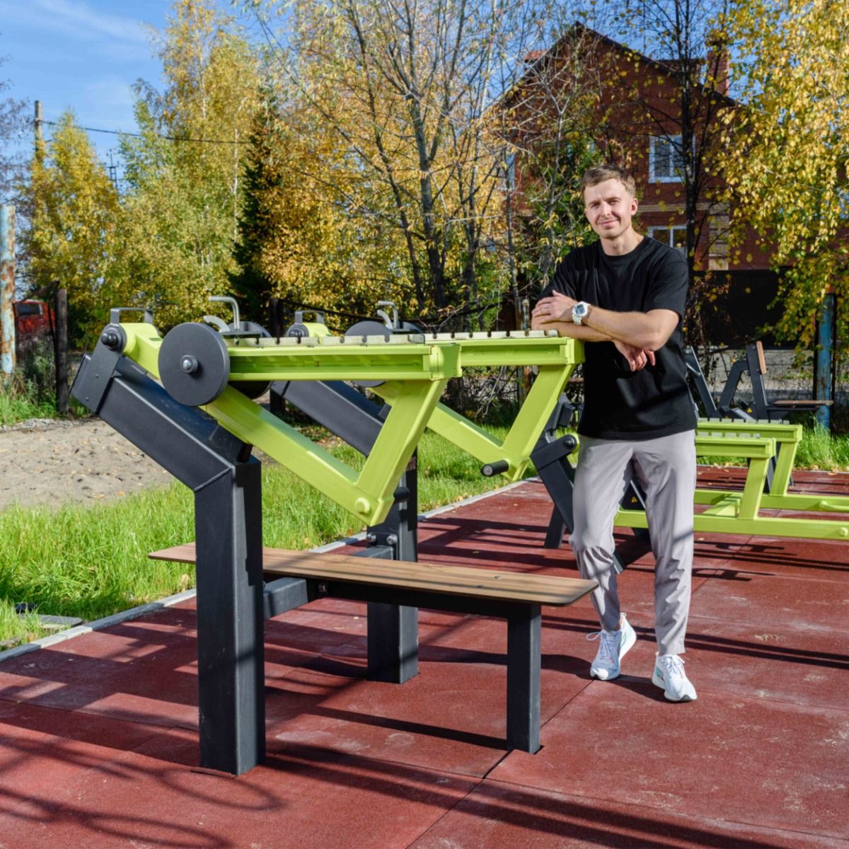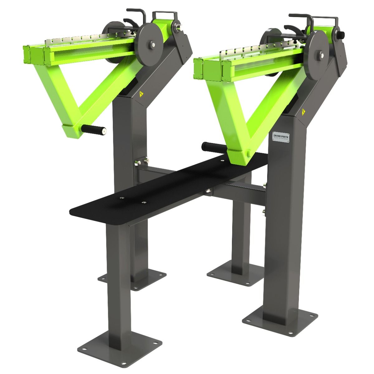Несущая конструкция уличного тренажера выполнена из профильных труб 140×140 с толщиной стенки 5 мм. Детали изготовлены из листового металла толщиной 8 мм, 4 мм и 3 мм.