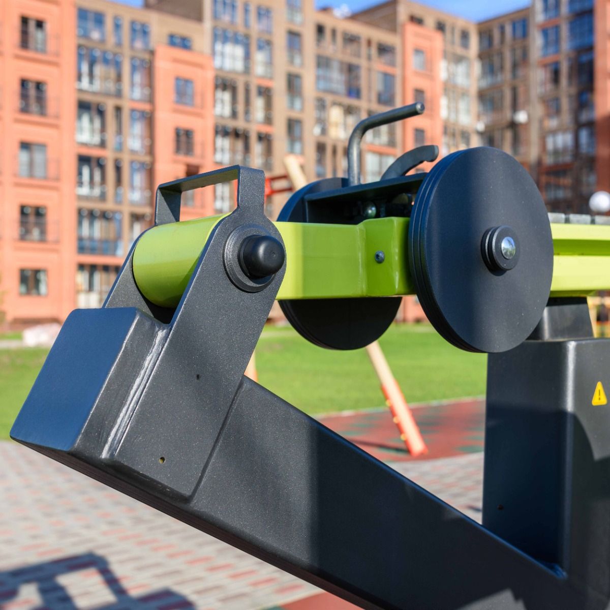 Надёжность и прочность разъёмных соединений конструктивных элементов тренажёра обеспечиваются за счёт использования высококачественного оцинкованного крепежа, выступающие части которого закрыты металлическими защитными колпачками.