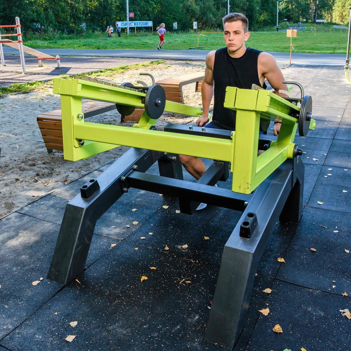 Несущая конструкция уличного тренажера выполнена из профильных труб 140×140 с толщиной стенки 5 мм. Детали изготовлены из листового металла толщиной 8 мм.