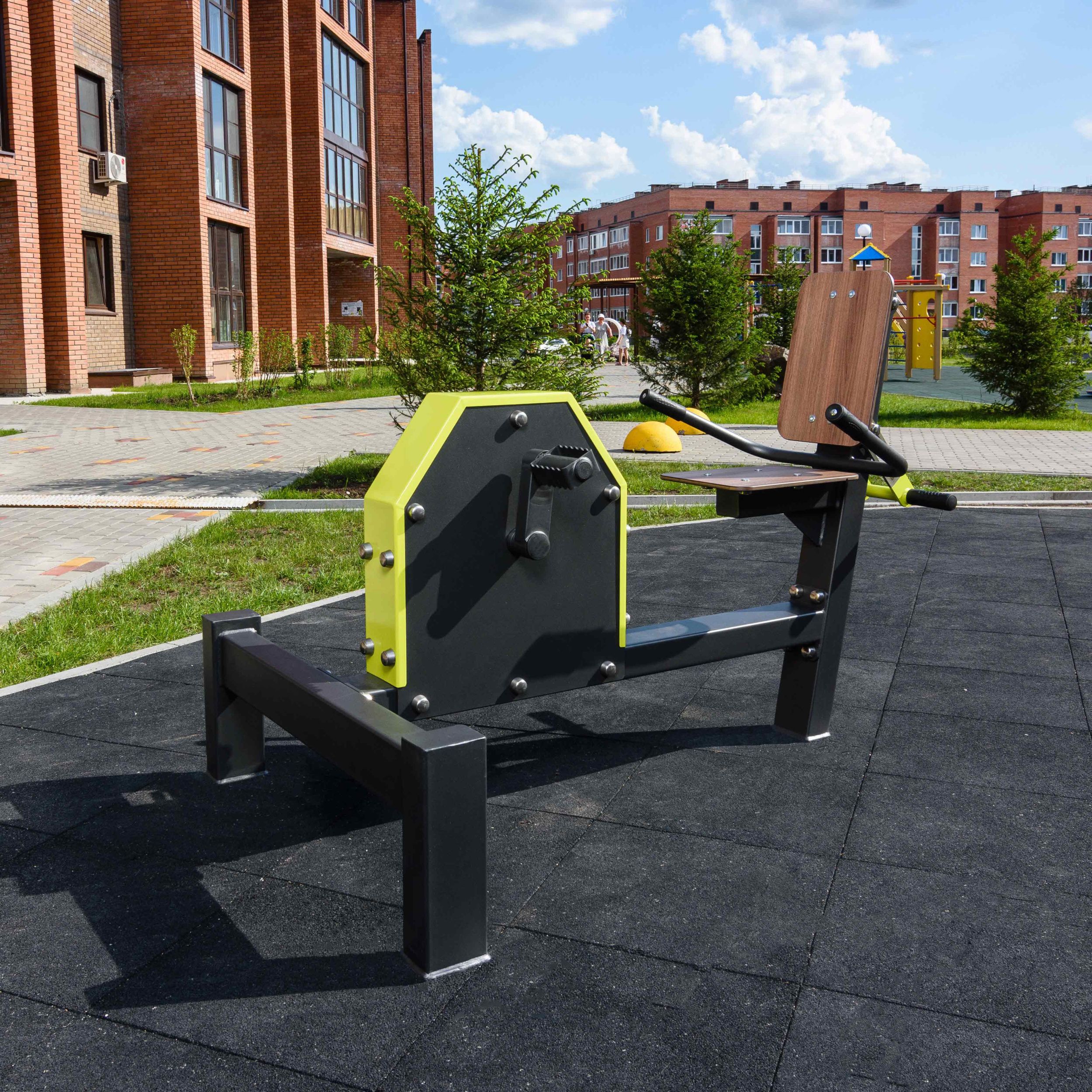 Несущая конструкция уличного тренажера выполнена из профильной трубы 120×80 мм с толщиной стенки 3 мм. Детали изготовлены из листового металла толщиной 8 мм и 4 мм.