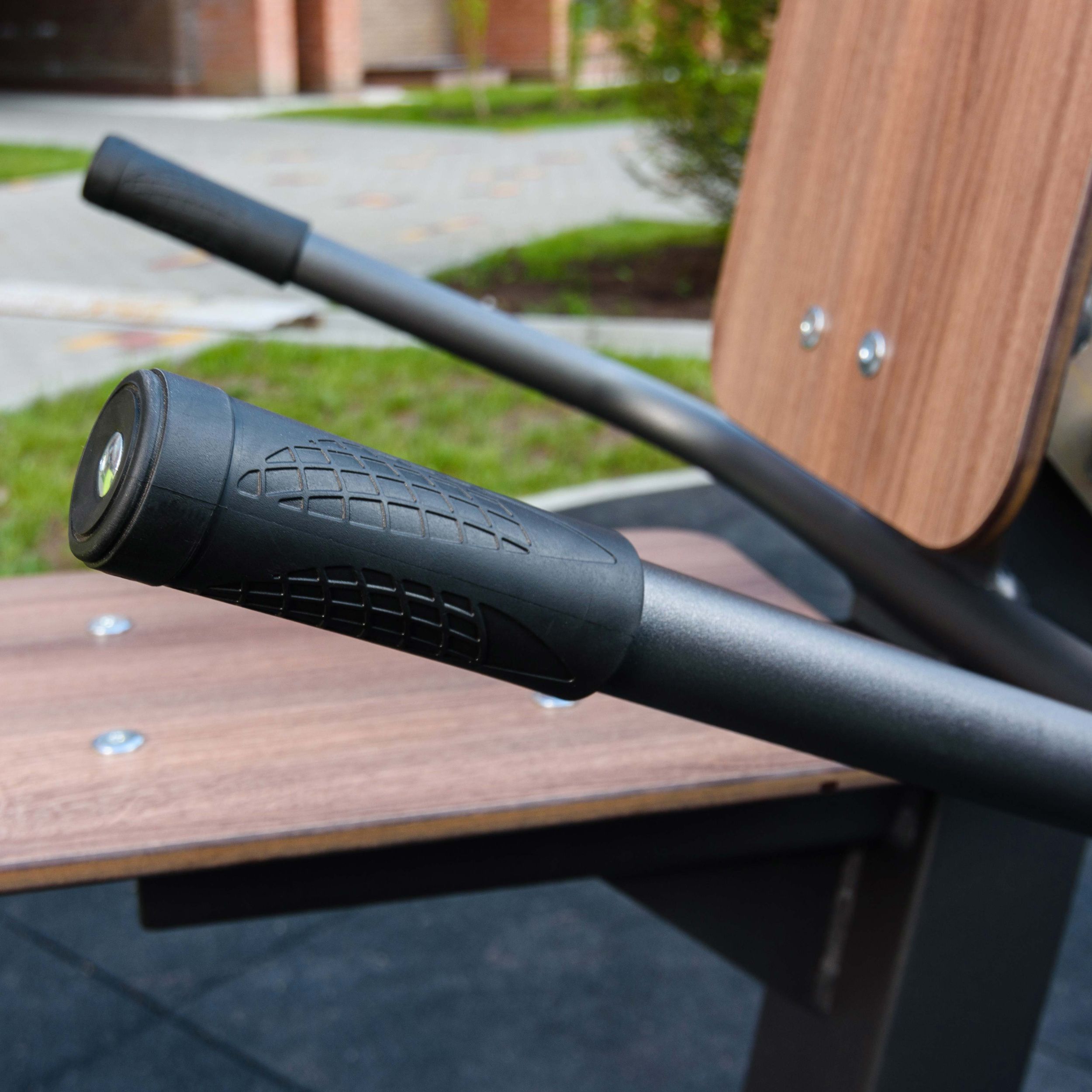 Рукояти для поддержки во время выполнения упражнения вдоль сиденья и рукояти для регулировки спинки тренажера выполнены из стальной трубы диаметром 33 мм с толщиной стенки 3,2 мм.