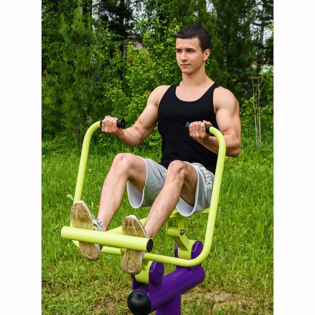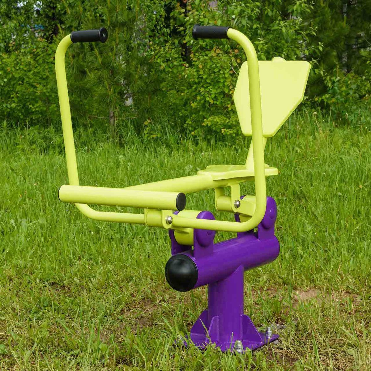 Оборудование состоит из опорного столба, сиденья со спинкой и упором для ног, рычага с рукоятями и закладной. Закладная монтируется в грунт и заливается бетоном. Опорный столб крепится к закладной за счет фланцевого соединения и отсыпается песчано-гравийной смесью до уровня площадки. Фланцевое крепление позволяет надёжно смонтировать оборудование и беспрепятственно демонтировать при необходимости обслуживания. Монтажные схемы прилагаются к комплекту поставки.
