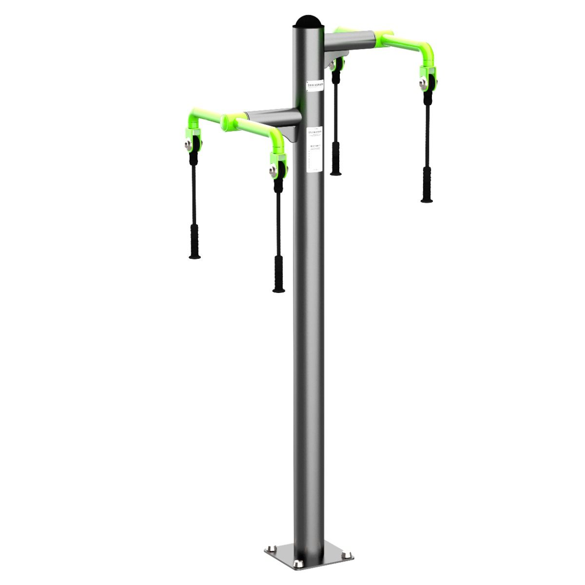 Рычаги с прочным канатом и эргономичными рукоятями с обрезиненным покрытием изготовлены из стальной трубы диаметром 48 мм с толщиной стенки 3,5 мм. Рычаги закреплены на столбе через поворотные узлы, что позволяет выполнять упражнения с естественной амплитудой движения