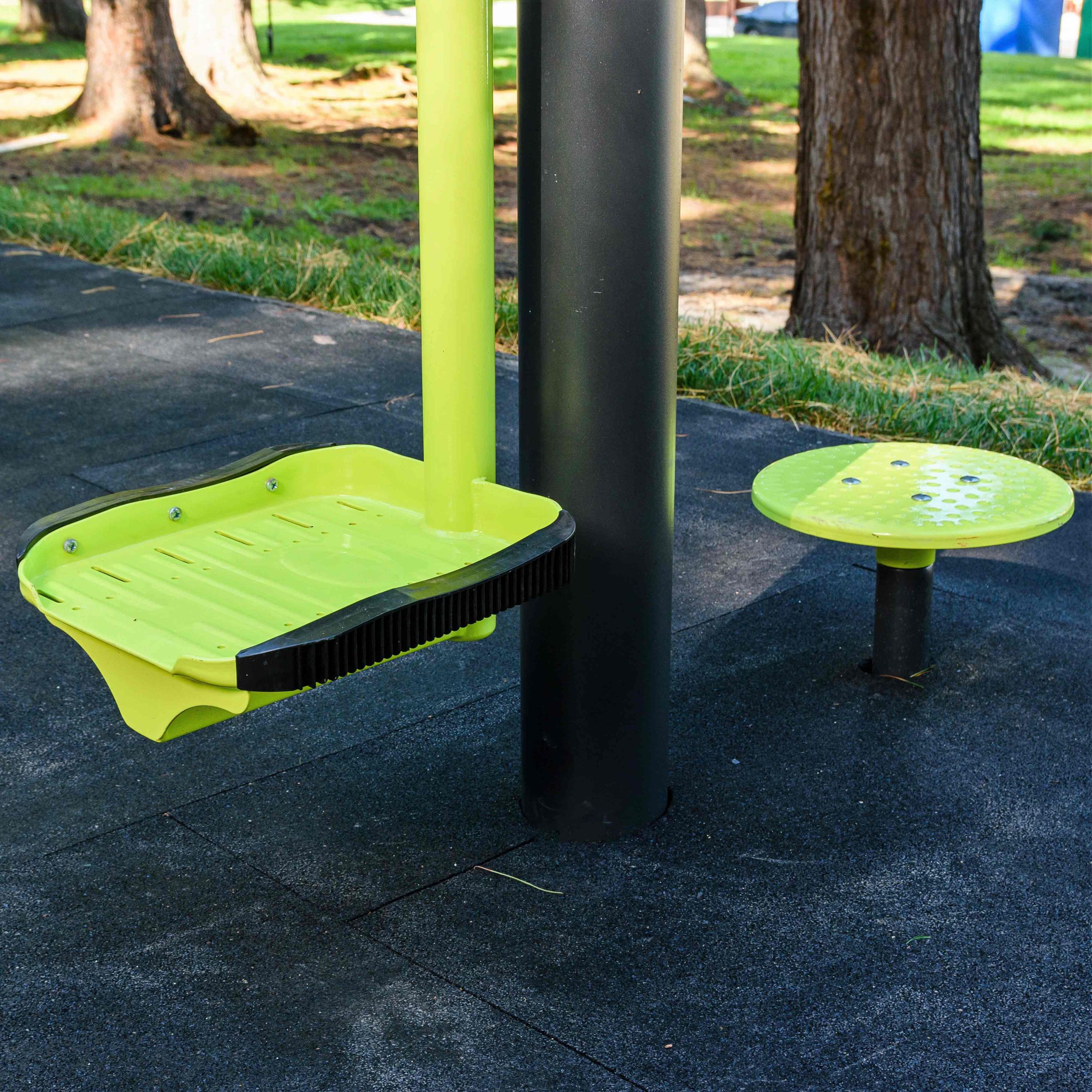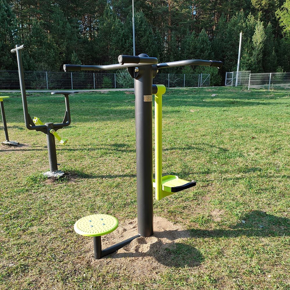 Оборудование состоит из опорного столба, рукоятей, диска с узлом вращения, рычага с опорой для ног и закладной. Закладная монтируется в грунт и заливается бетоном. Опорный столб крепится к закладной за счет фланцевого соединения и отсыпается песчано-гравийной смесью до уровня площадки. Фланцевое крепление позволяет надёжно смонтировать оборудование и беспрепятственно демонтировать при необходимости обслуживания. Монтажные схемы прилагаются к комплекту поставки.