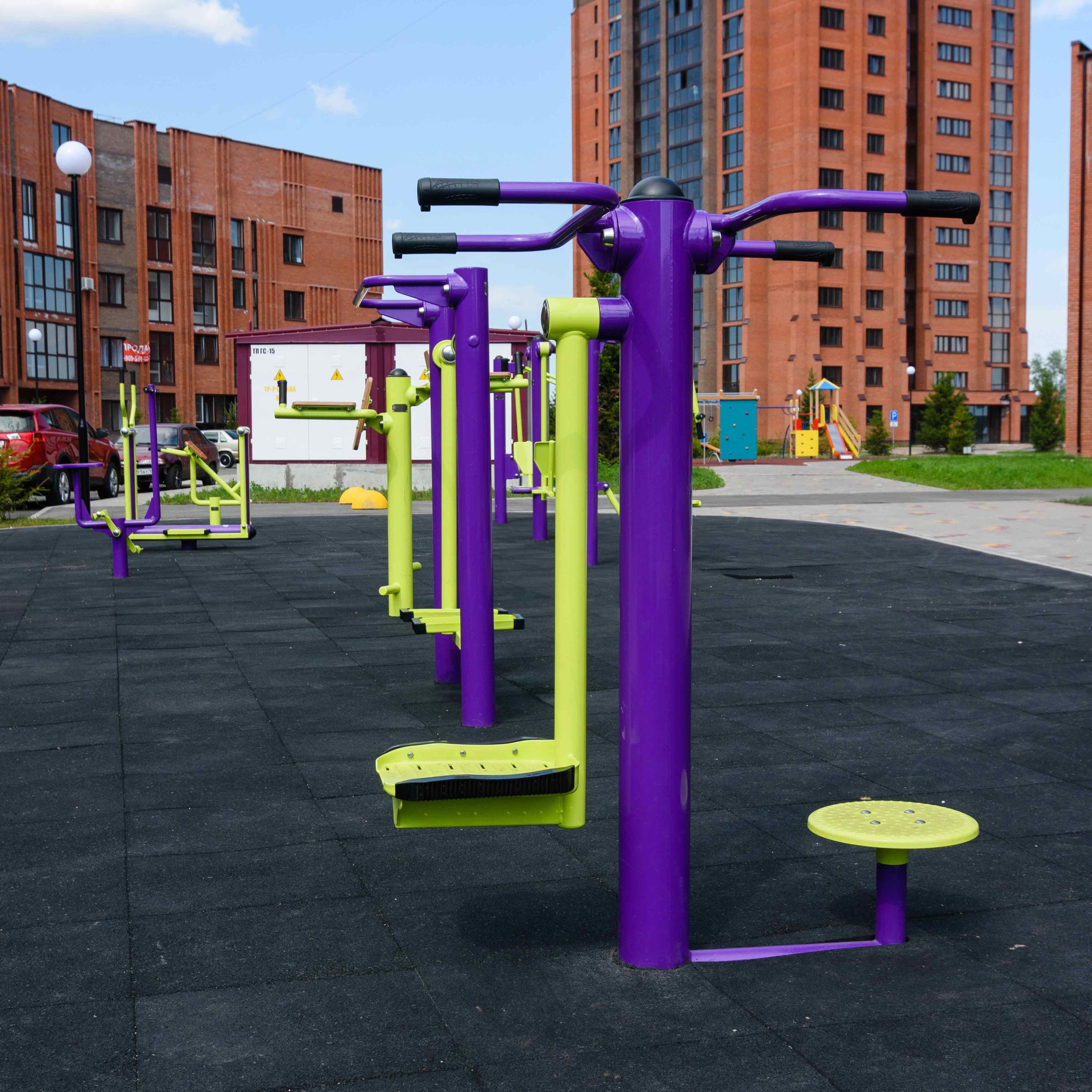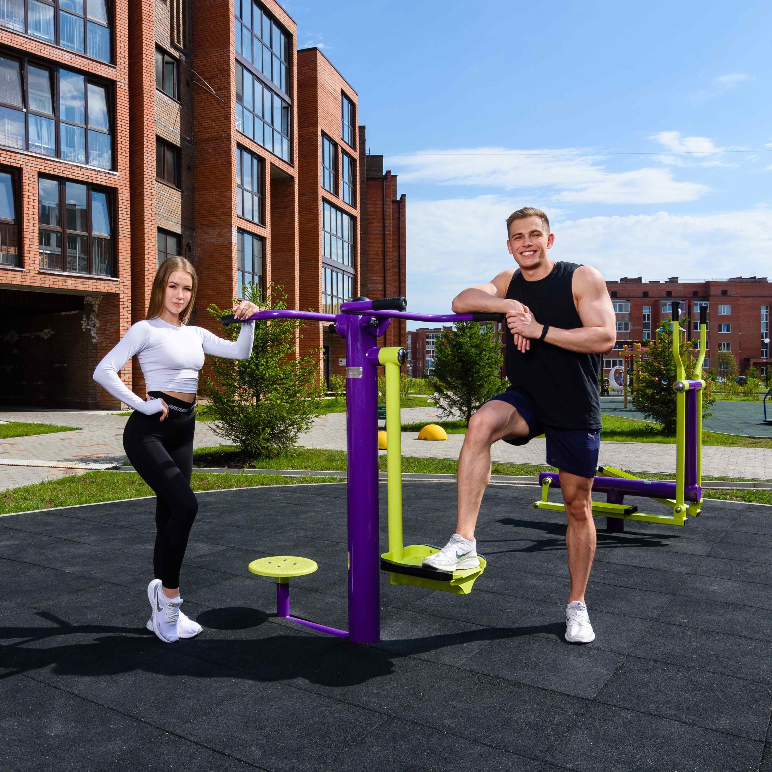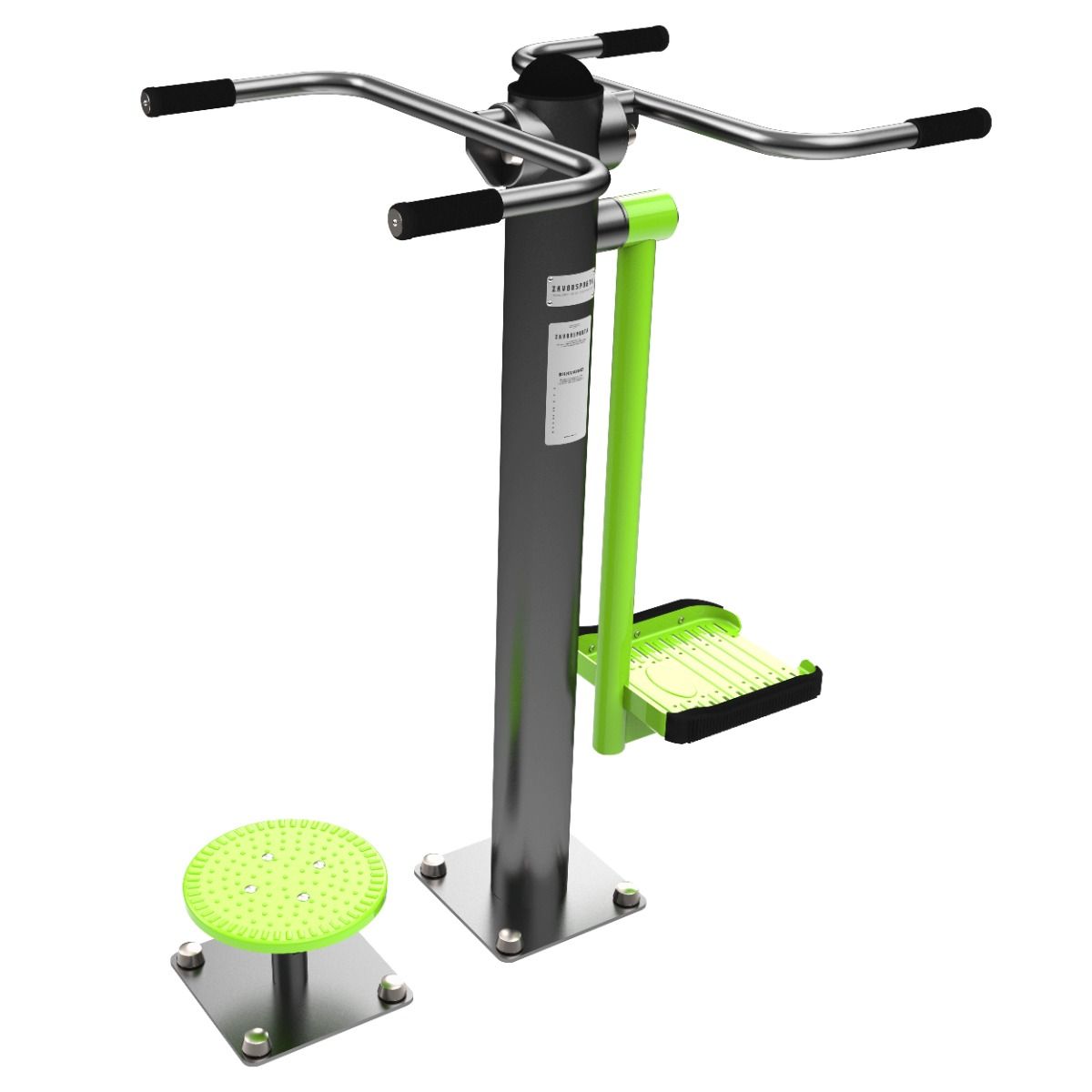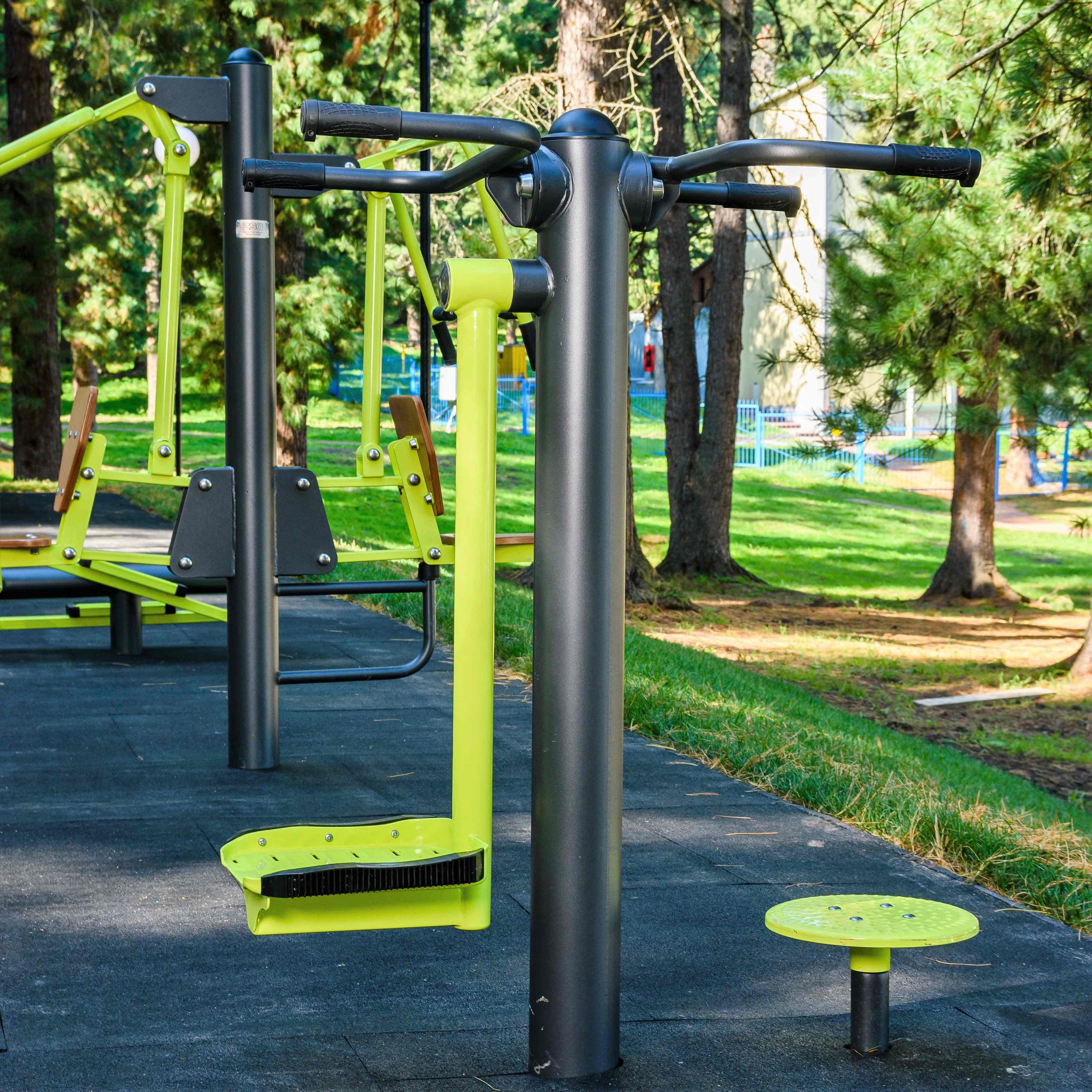 Сдвоенный тренажер оснащен двумя рукоятями, выполненными из стальной трубы диаметром 33 мм с толщиной стенки 3,2 мм. Радиус изгиба трубы 90 мм.