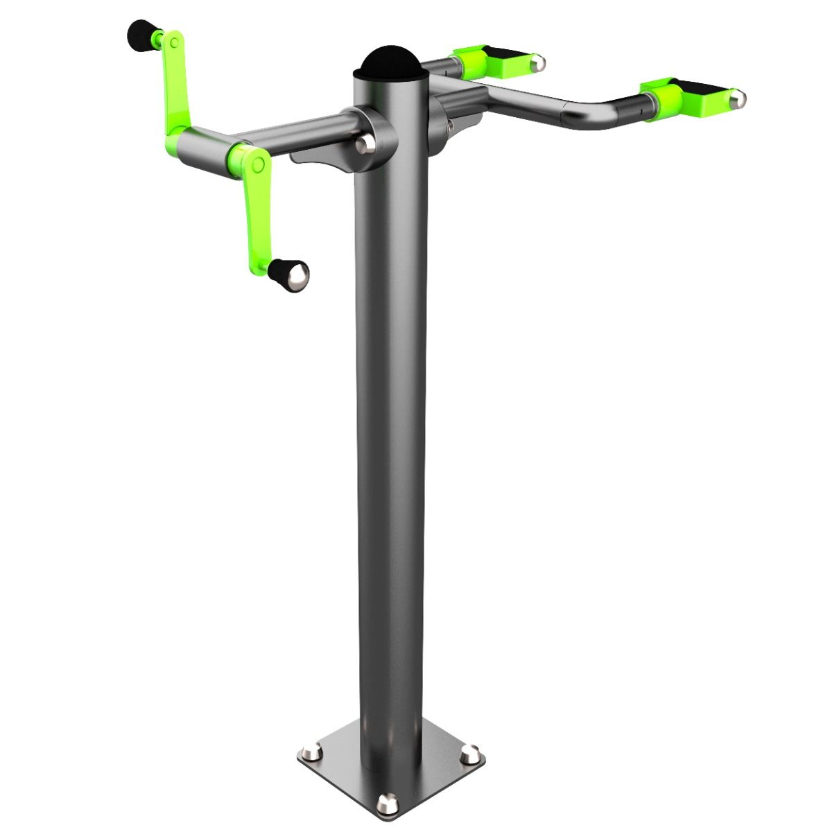 Фланцевое соединение опорного столба с закладной производится через четыре овальных отверстия размером 22×30 мм, расположенных на расстоянии 240 мм. Овальные отверстия под болтовое крепление М16 позволяют дополнительно регулировать положение тренажера. Резьбовые соединения защищены составными металлическими колпачками, входящими в комплект поставки.