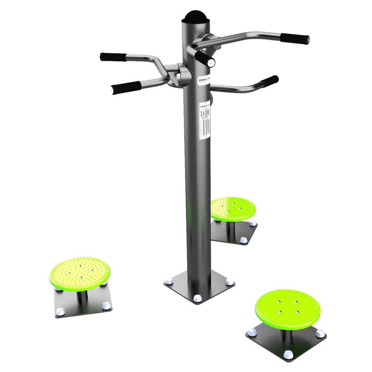 Оборудование состоит из опорного столба, рукоятей, дисков с узлами вращения и закладных. Закладные монтируются в грунт и заливаются бетоном. Опорный столб и диски крепятся к закладным за счет фланцевого соединения и отсыпаются песчано-гравийной смесью до уровня площадки. Фланцевое крепление позволяет надёжно смонтировать оборудование и беспрепятственно демонтировать при необходимости обслуживания. Монтажные схемы прилагаются к комплекту поставки.