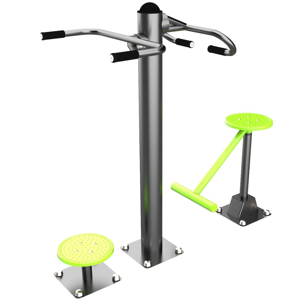 Оборудование состоит из опорных столбов, рукоятей, дисков с узлами вращения и закладных. Закладные монтируются в грунт и заливаются бетоном. Опорные столбы крепятся к закладным за счет фланцевого соединения и отсыпаются песчано-гравийной смесью до уровня площадки. Фланцевое крепление позволяет надёжно смонтировать оборудование и беспрепятственно демонтировать при необходимости обслуживания. Монтажные схемы прилагаются к комплекту поставки.