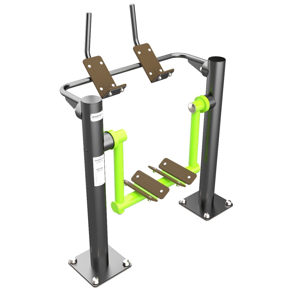 Оборудование состоит из опорных столбов, рычага с опорами для ног, рукояти и закладных. Закладные монтируются в грунт и заливаются бетоном. Опорные столбы крепятся к закладным за счет фланцевого соединения и отсыпаются песчано-гравийной смесью до уровня площадки. Фланцевое крепление позволяет надёжно смонтировать оборудование и беспрепятственно демонтировать при необходимости обслуживания. Монтажные схемы прилагаются к комплекту поставки.