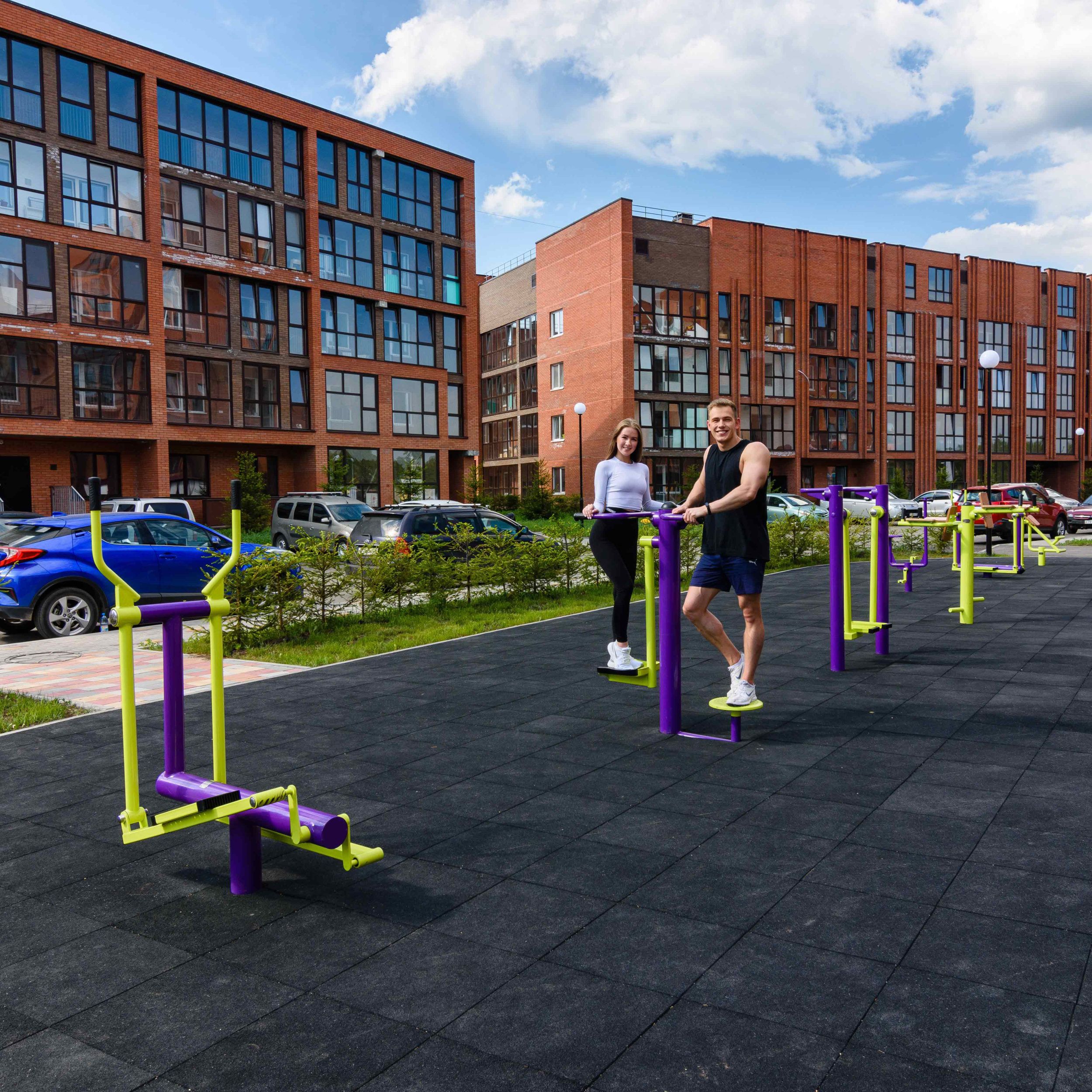 Фланцевое соединение опорного столба с закладной производится через четыре овальных отверстия размером 22×30 мм, расположенных на расстоянии 240 мм. Овальные отверстия под болтовое крепление М16 позволяют дополнительно регулировать положение тренажера. Резьбовые соединения защищены составными металлическими колпачками, входящими в комплект поставки.