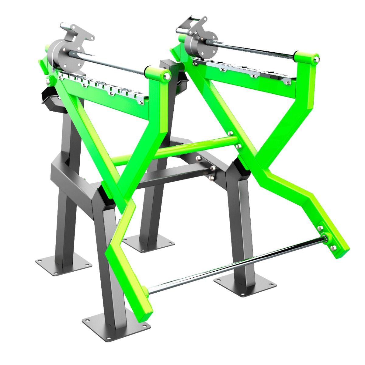 Несущая конструкция уличного тренажера выполнена из профильных труб 120×80 мм и 100×50 мм с толщиной стенки 3 мм. Детали изготовлены из листового металла толщиной 8 мм и 3 мм.