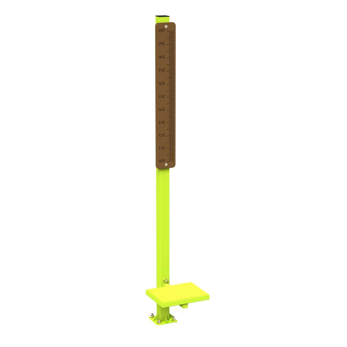 Основание рамы линейки для измерения роста выполнено из труб 80х80 мм с толщиной стенки 3 мм. Площадка для ног выполнена из листового рифлёного листа толщиной 3 мм. Основание площадки выполнено из трубы 40х40 стенка 2 мм и листового метала толщиной 6 мм. Измерительная шкала выполнена из качественной фанеры толщиной 24 мм. Разметка на измерительную шкалу нанесена с помощью высокоточного фрезерного оборудования. Интервал разметки на измерительной шкале от 1000 мм до 2000 мм, с шагом 10 мм. Незакрытые металлом торцы труб, закрываются пластиковыми заглушками.