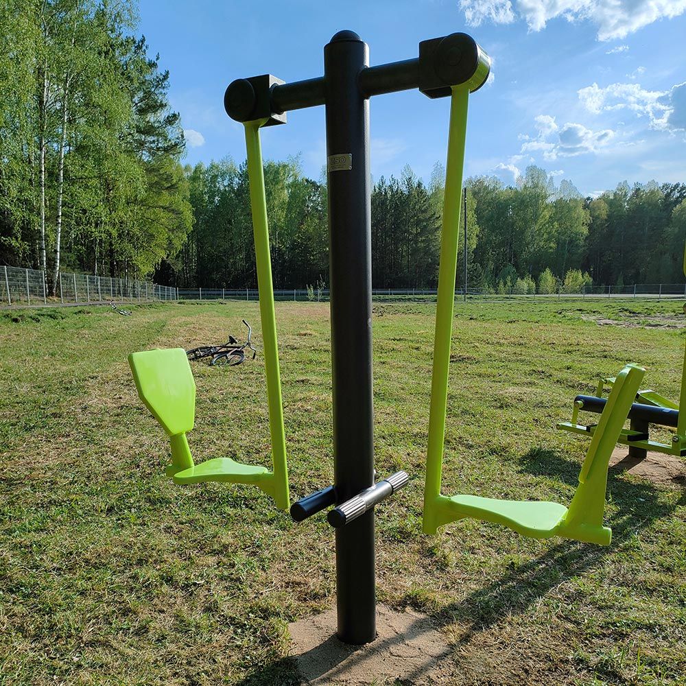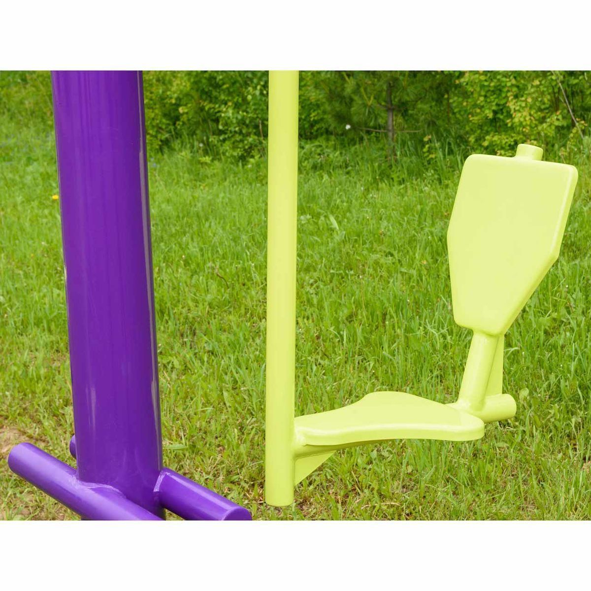 Тренажёр предназначен для тренировки мышц ног.Конструктивно тренажёр состоит из рамы-столба, и установленного через узлы ограниченного вращения рычагов с сиденьями и спинками. За счёт применения специально разработанных узлов с ограничением вращения, в конструкции отсутствуют открытые отбойные элементы, что ведёт к уменьшению травмоопасности.