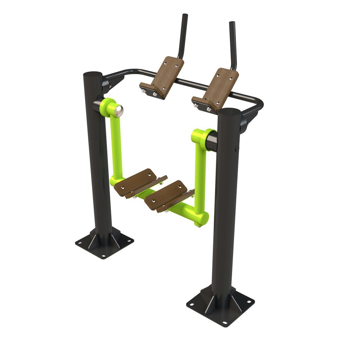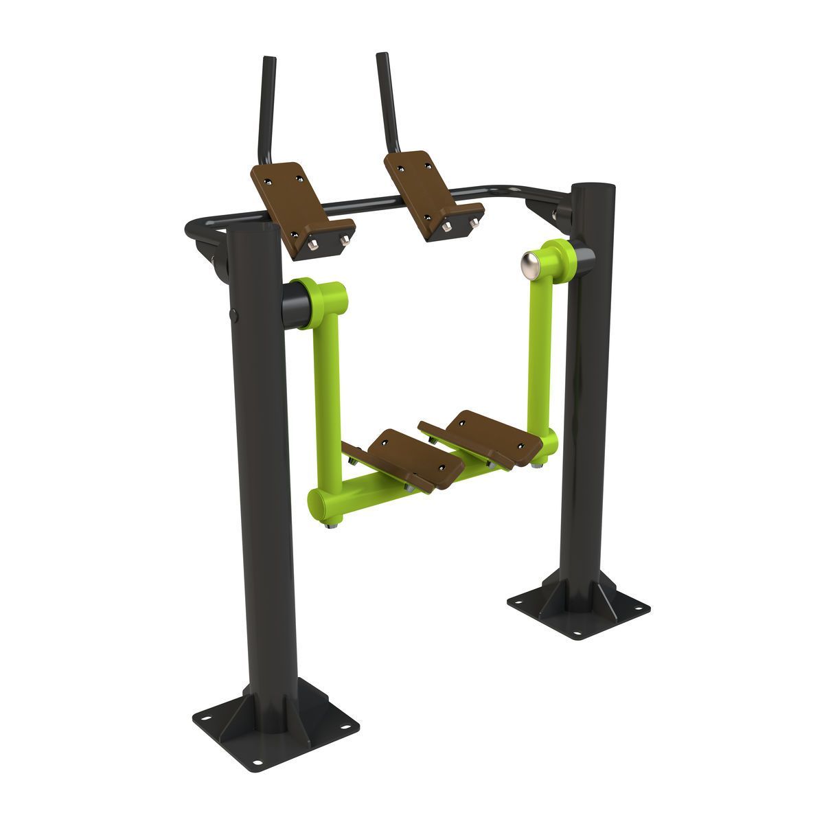 Тренажер состоит из следующих основных элементов:- Столбы;- Ручка-упор;- Рычаги;- Планка-упор для ног;- Закладные.