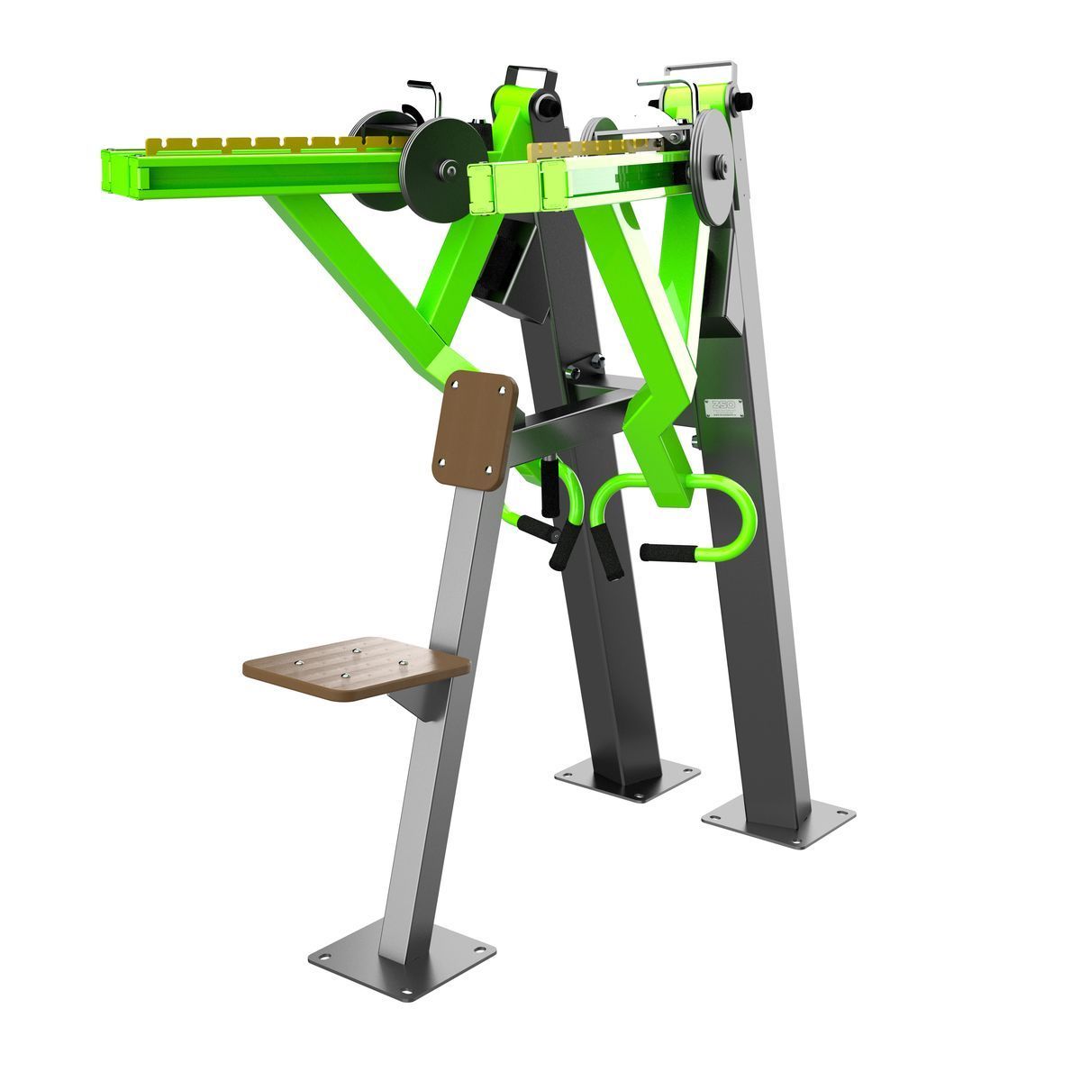 Уличный тренажер «Нижняя тяга», предназначен для функциональных тренировок на открытом воздухе. Нижняя тяга - базовое физическое упражнение в бодибилдинге. Основная цель упражнения: развитие и проработка, а также увеличение силовых показателей мышц спины, придание V-образного вида торсу (широкие плечи и кажущаяся узкая талия).